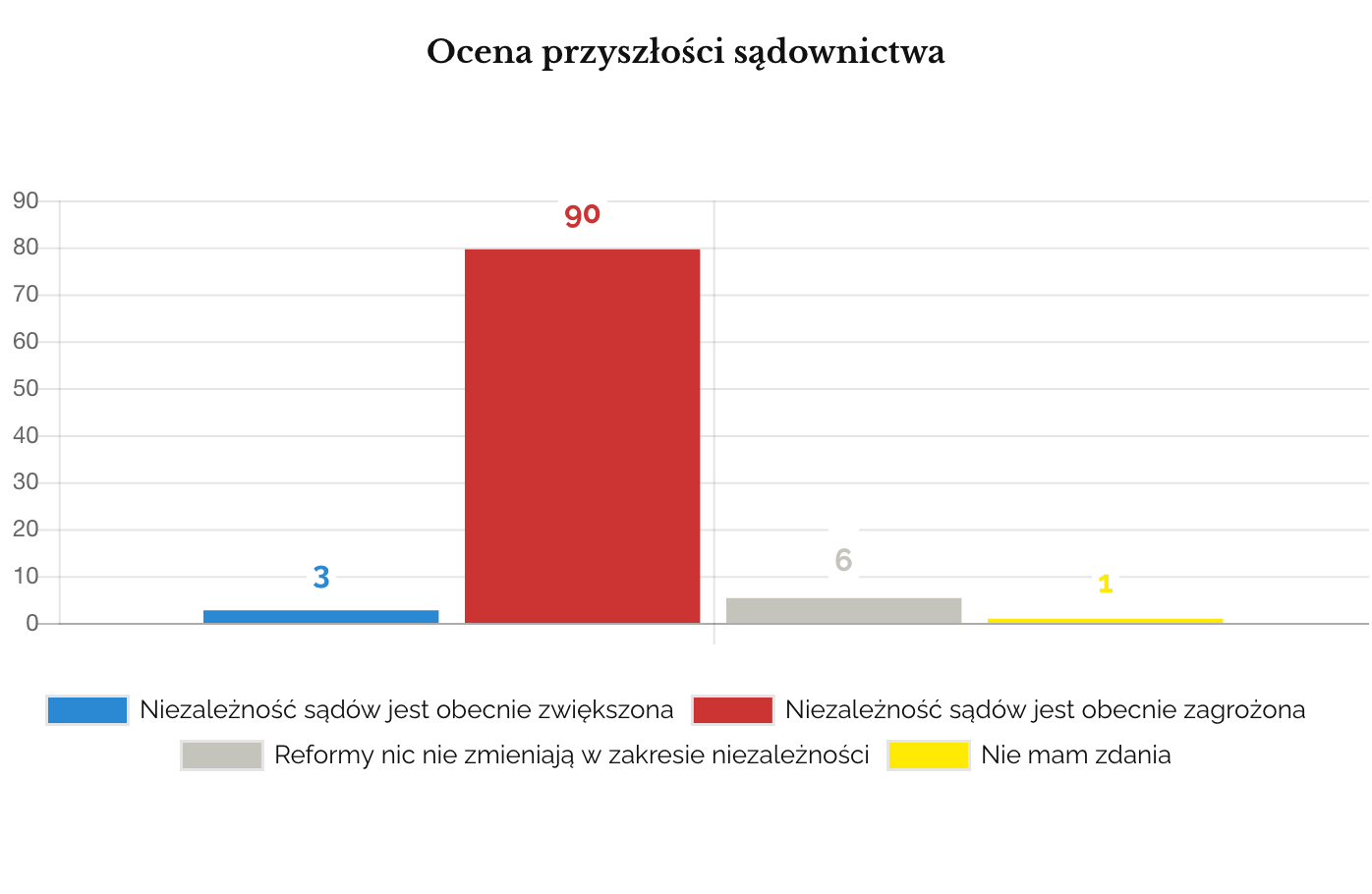 Z badania wynika, że ok. 3 proc. ankietowanych sędziów uznaje, że instytucje wymiaru sprawiedliwości po reformach w sądownictwie w latach 2017–2018 są mniej zależne od wpływów politycznych, a około 90 proc. ankietowanych uważa, że Krajowa Rada Sądownictwa, Trybunał Konstytucyjny oraz sądy są bardziej upolitycznione niż przed zmianami w wymiarze sprawiedliwości, wprowadzonymi w ciągu ostatnich dwóch lat.