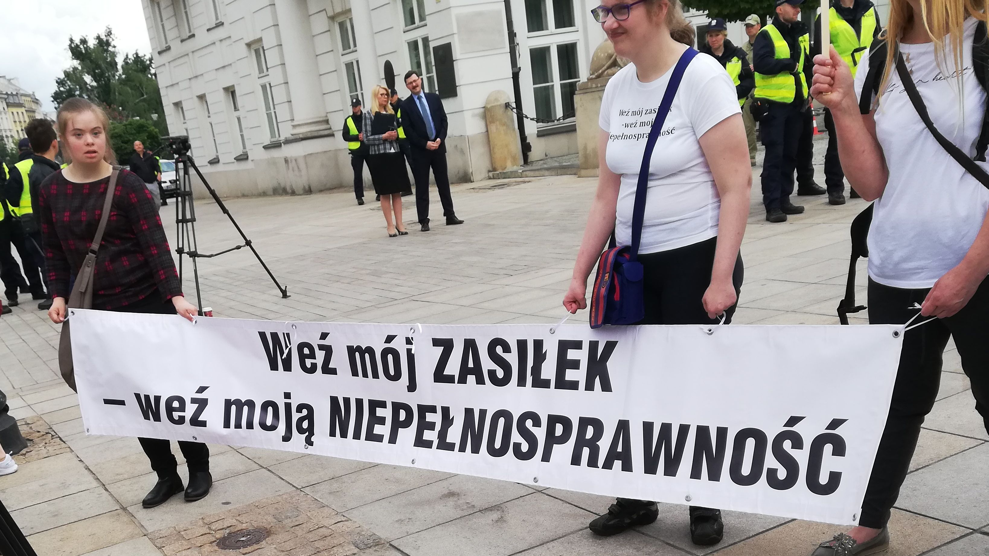 Podczas gdy Senat przegłosowywał ustawę, pod budynkiem odbywał się protest osób z niepełnosprawnościami. "Są pieniądze na loty marszałka, jest hajs na dofinansowanie piłkarzy, a nie ma pieniędzy dla osób najsłabszych. A my też jesteśmy ludźmi" - mówili uczestnicy.