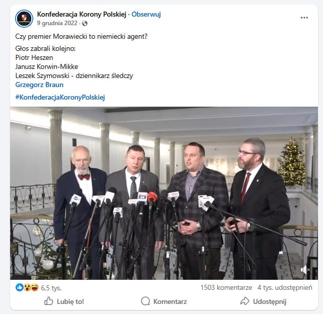 "Tyle wiem na ten temat, ile tam media donoszą, a media jak wiadomo, snują swoje narracje. I ja wnioskuję z tej w ostatnich dniach wzniesionej fali czarnego PR-u, że tutaj chodzi po prostu o kolejny atak na rosnącą siłę opozycyjną, którą jest Konfederacja Korony Polskiej, ze mną jako liderem. […] Kieruję pismo do pana ministra koordynatora służb specjalnych, pismo, w którym