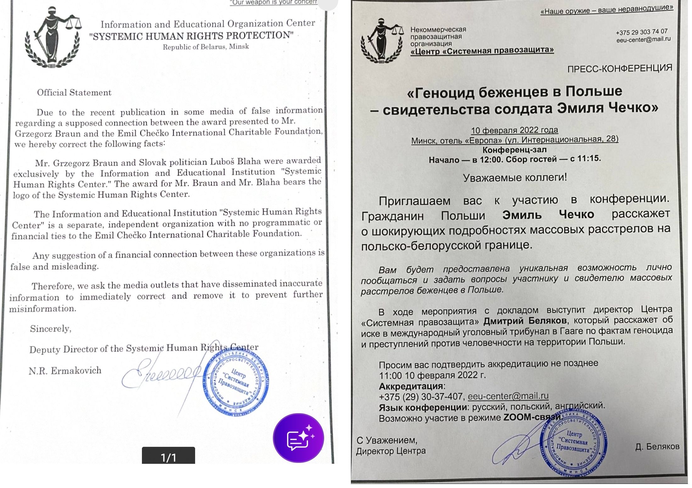 Dowodem na to ma być skan białoruskiego dokumentu – oświadczenia informującego, że w rzeczywistości nagrodę przyznała Braunowi inna organizacja. Też białoruska, ale nosząca inną nazwę i niezwiązana z Fundacją im. Emila Czeczki.