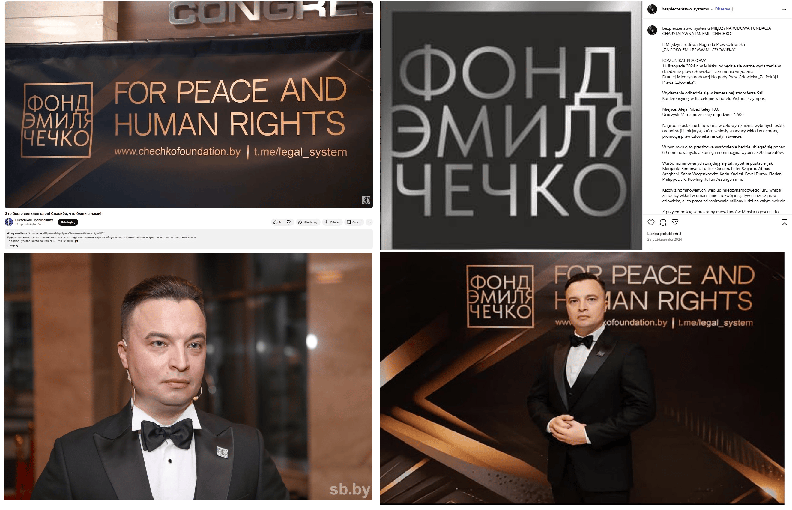 Centrum „Sistemnaja Prawozaszczita” w 2021 roku założył Dmitryj Bieliakow. Ten sam były funkcjonariusz białoruskich służb, który po śmierci Emila Czeczko założył Międzynarodową Fundację Charytatywną jego imienia. Tę, która przyznaje białoruskie Nagrody Pokoju i Praw Człowieka. Czyli mamy dwie organizacje, prowadzone przez tego samego człowieka (Bielakow nadal zasiada we władzach obu) i korzystające na Telegramie z tego samego kanału @legal_system.
