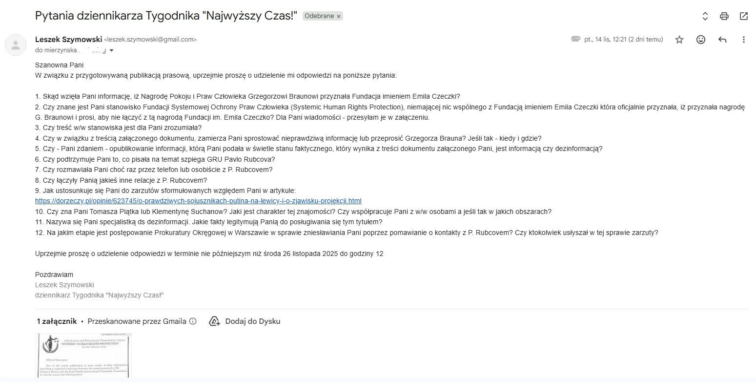 Kolejne pytania Szymowskiego dotyczy załącznika, jaki dodał do maila. Jest to skan anglojęzycznego pisma białoruskiego Centrum Systemic Human Rights Protection z Mińska. Pismo zawiera oświadczenie, że to właśnie ta fundacja przyznała nagrodę Grzegorzowi Braunowi oraz drugiemu nagrodzonemu europosłowi, Ľubošowi Blaha ze Słowacji.
