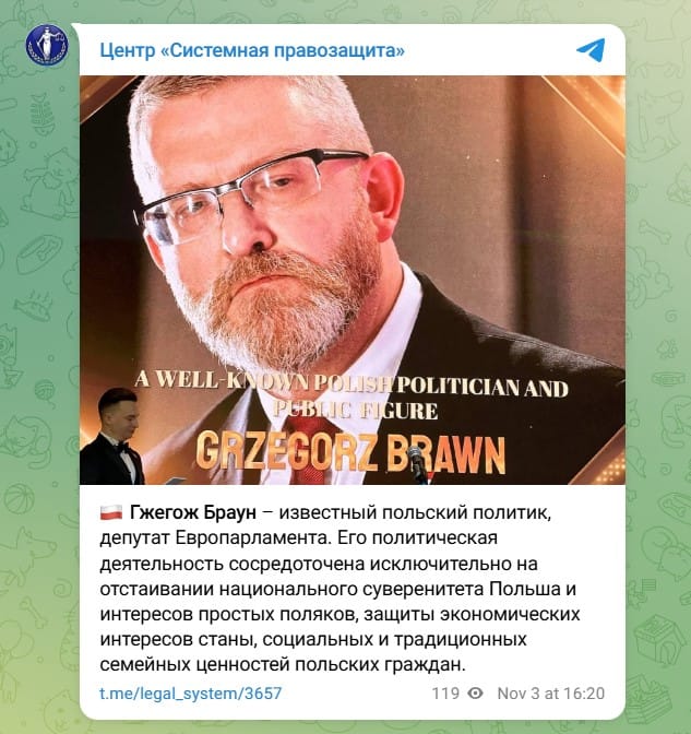 Ponadto wpis prezentujący sylwetkę Grzegorza Brauna wśród innych laureatów nagrody Fundacji im. Emila Czeczki znalazł się na kanale @legal_system na platformie Telegram. Jest to kanał używany do publikacji treści m.in. Fundacji im. Czeczki.