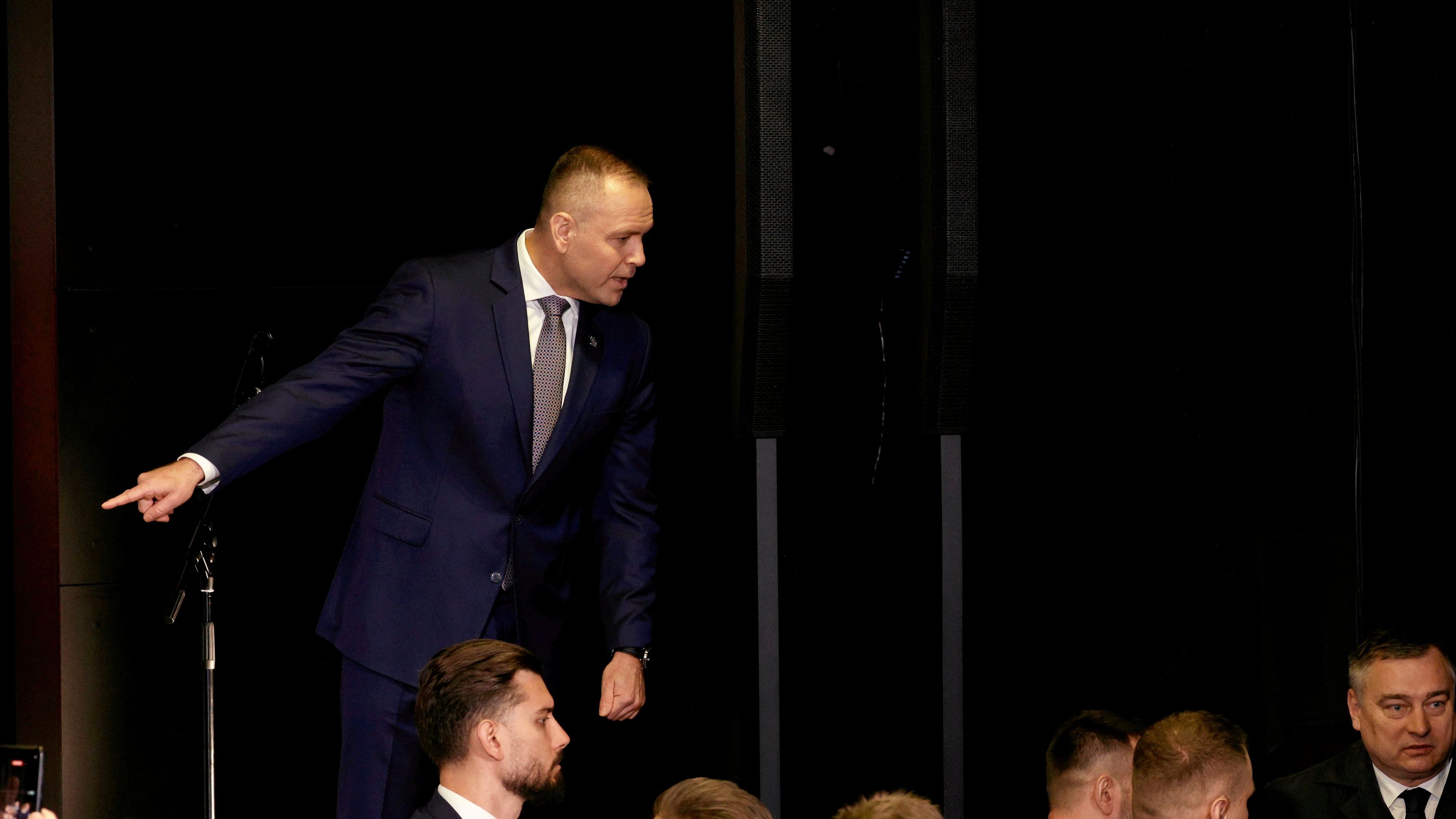 2 sek. Leśkiewcz mówi coś Nawrockiemu. Odwraca się i kieruje wzrok w stronę sali, Nawrocki słucha i kiwa głową.