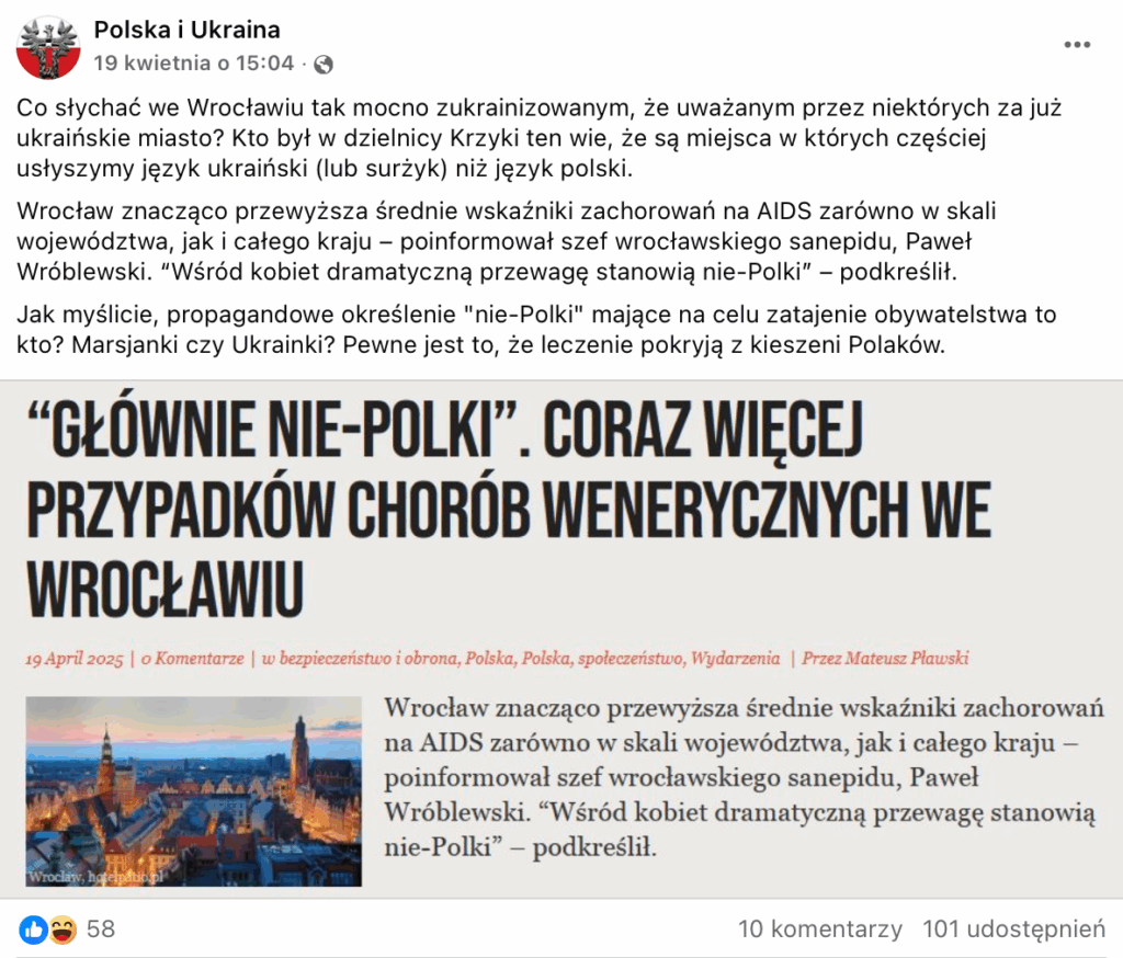 Wyżej wskazany autor nawiązuje również do chorób wenerycznych, jeszcze dalej posuwa się natomiast profil Polska i Ukraina. Post zamieszczony na grupie STOP UKRAINIZACJI POLSKI zawiera screenshot z artykułu kresy.pl, w którym jest mowa o zwiększonej ilości przypadków HIV we Wrocławiu.