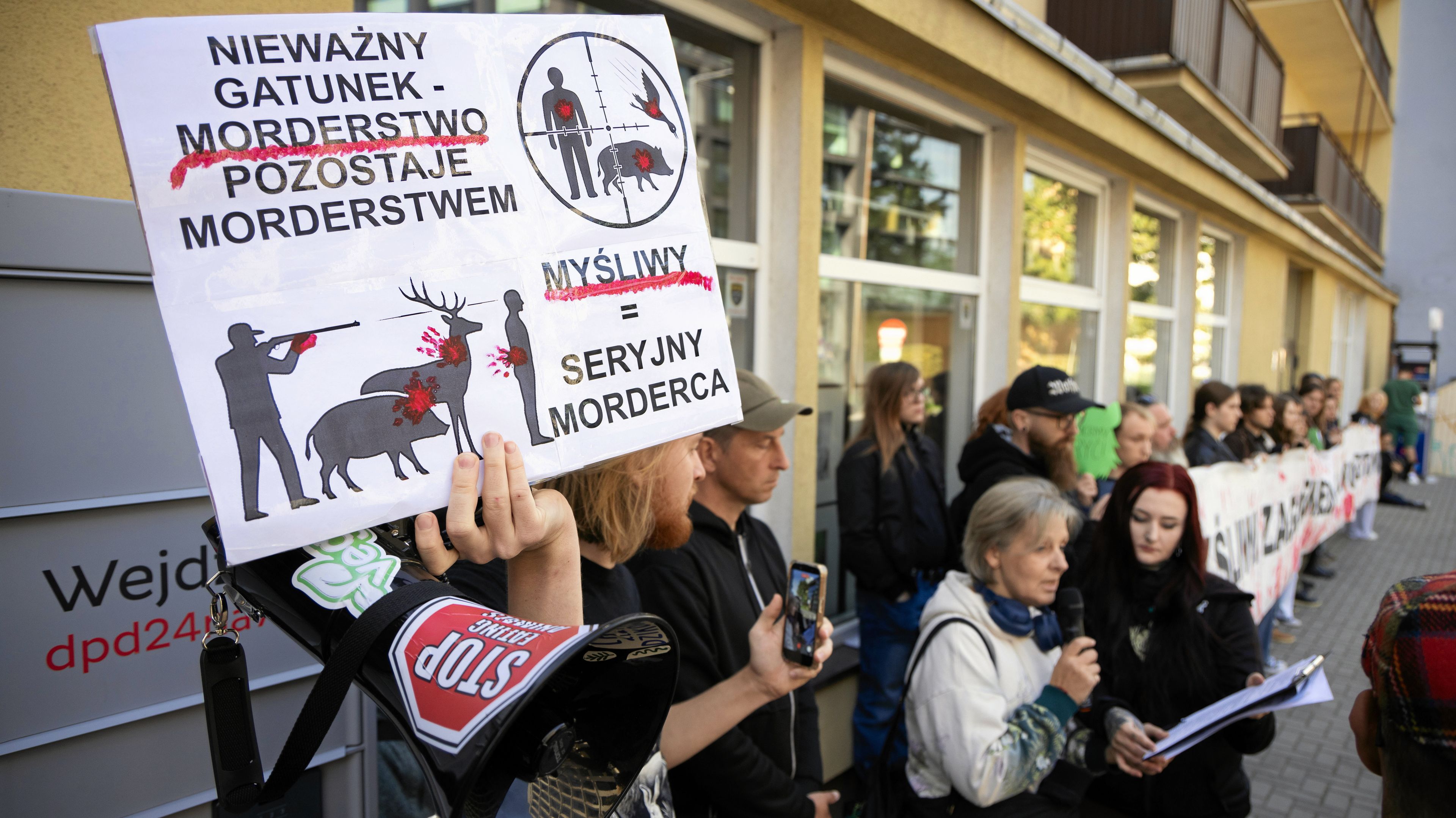 Na zdjęciu u góry: Pikieta Lubelskiego Ruchu Antyłowieckiego zorganizowana pod siedzibą Polskiego Związku Łowieckiego Zarządu Okręgowego w Lublinie 27 września 2025 pod hasłem przewodnim „Pomyliłem z dzikiem. Kto będzie następny?”. Akcja odnosi się do tragicznego wydarzenia, które miało miejsce w lipcu 2025 roku w miejscowości Młyniska na Lubelszczyźnie, gdzie myśliwy podczas nocnego polowania zastrzelił 60-letniego mężczyznę, bo pomylił go z dzikiem. Fot. Jakub Orzechowski / Agencja Wyborcza.pl