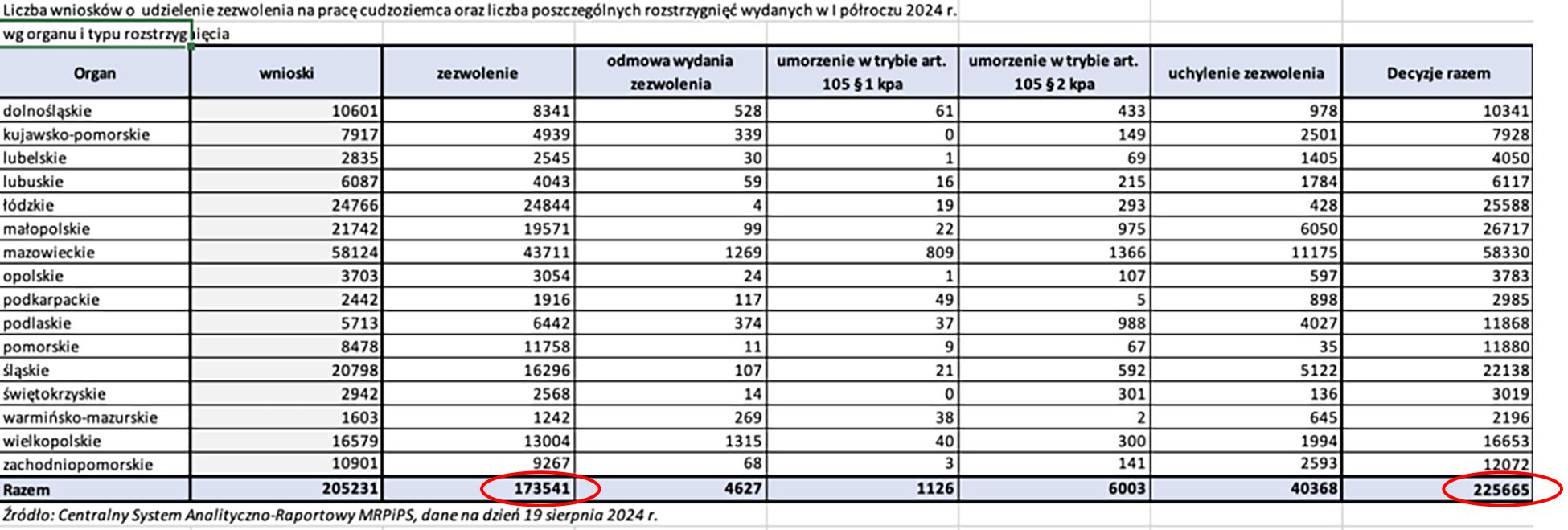 Aby udowodnić tezę o mojej manipulacji, Duszczyk publikuje tabelki podsumowujące, ile wniosków o zezwolenie na pracę dla cudzoziemców złożono w I półroczu 2024 oraz w I półroczu 2025 roku i jakie decyzje podjęto. W artykule korzystałem z tych samych danych ministerstwa pracy. I tu pojawia się pierwszy z czterech problem ministra.