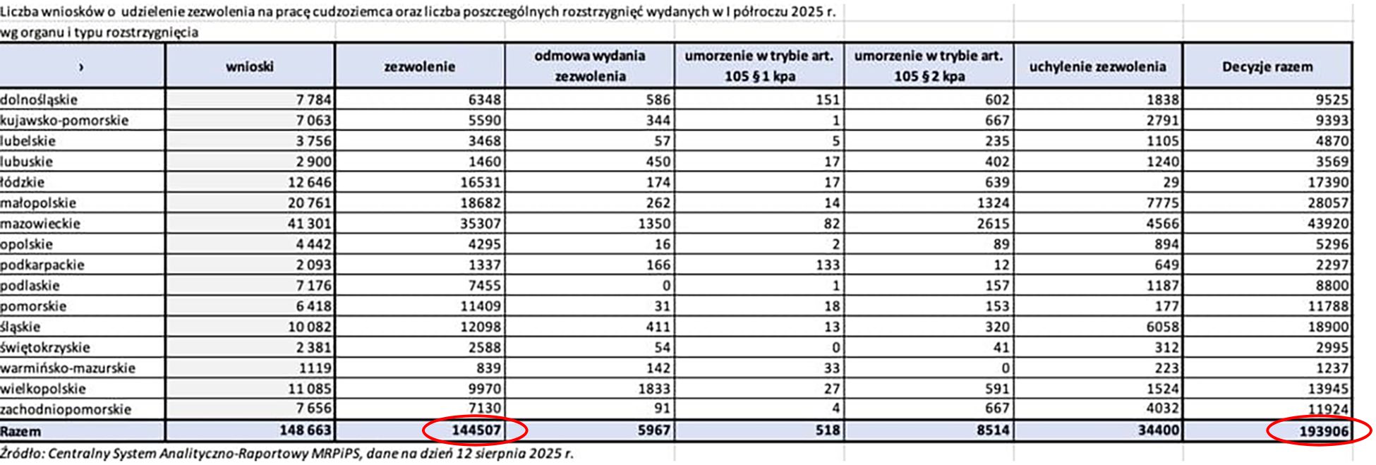 Podobne pomylenie kolumn przytrafiło się Duszczykowi przy czytaniu tabelki z I półrocza 2025. Pisze: „I przychodzi I półrocze naszych rządów. W tym wyeliminowanie zezwoleń dla pozoru i fejkowych agencji zatrudnienia. Zdecydowanie poniżej 200 tys.”. Znowu – poniżej 200 tys. decyzji, a zezwoleń 144 507 (stanowią 75 proc. wszystkich decyzji).