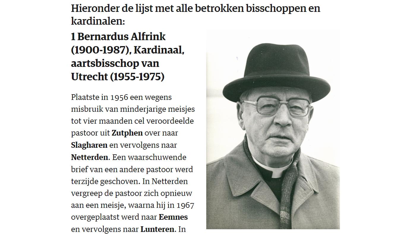 Na przykład w 1969 roku wyszło na jaw, że kapelan w mieście Maastricht molestował sześcio-, siedmioletnie dziewczynki. Zamiast kary otrzymał parafię w miasteczku Thorn. Mimo że proboszcz dalej wykorzystywał dzieci, kolejny biskup przesuwał go z parafii do parafii. „Zwiedzając” w ten sposób całą prowincję Limburgię, przez dwadzieścia lat mógł bezkarnie robić swoje.