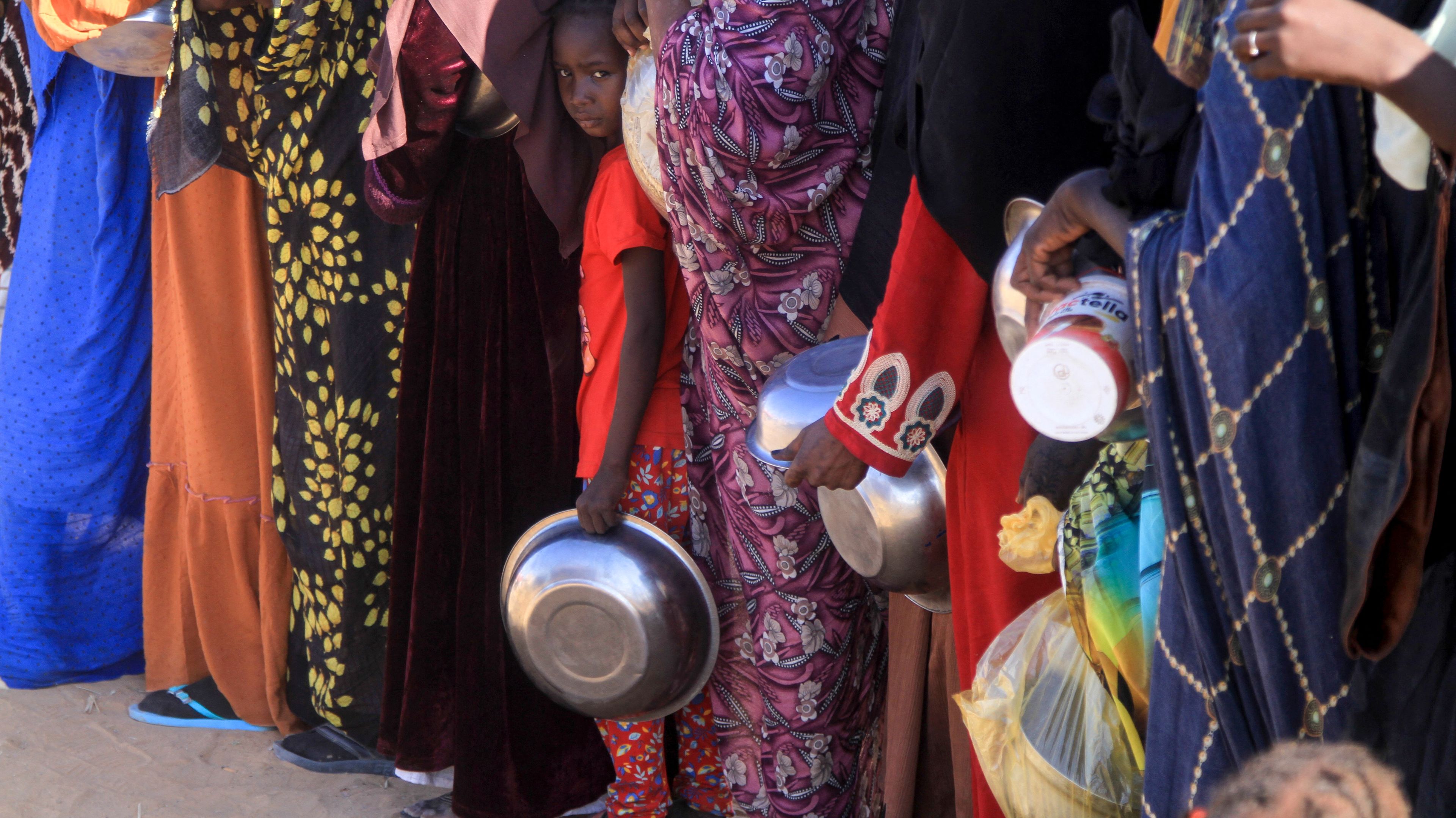 Na zdjęciu: sudańska dziewczynka, która uciekła z Al-Faszir, stoi w kolejce wraz z innymi kobietami, aby otrzymać bezpłatny posiłek w obozie dla przesiedleńców Al-Afad w miejscowości Ad-Dabba w północnym Sudanie, 20 listopada 2025 r. (Zdjęcie: Ebrahim HAMID / AFP)