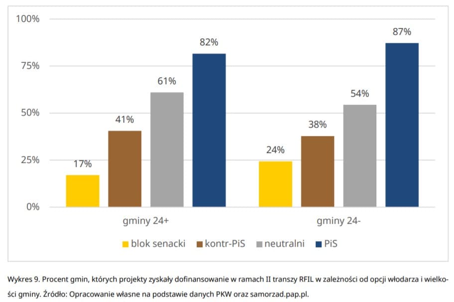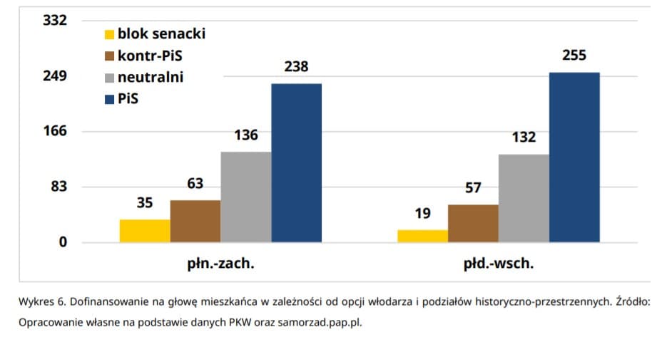 W gminach powyżej 24 000 mieszkańców kierowanych przez burmistrzów z PiS dotacja wynosi prawie 200 zł na osobę, czyli jest czterokrotnie większa niż w małych gminach rządzonych przez włodarzy związanych z blokiem senackim, ponad dwukrotnie większa w stosunku do mniejszych gmin z włodarzami kontr-PiS oraz o ⅓ większa niż w gminach, w których rywalizacja polityczna nie wpasowuje się w ogólnokrajowe wzory.