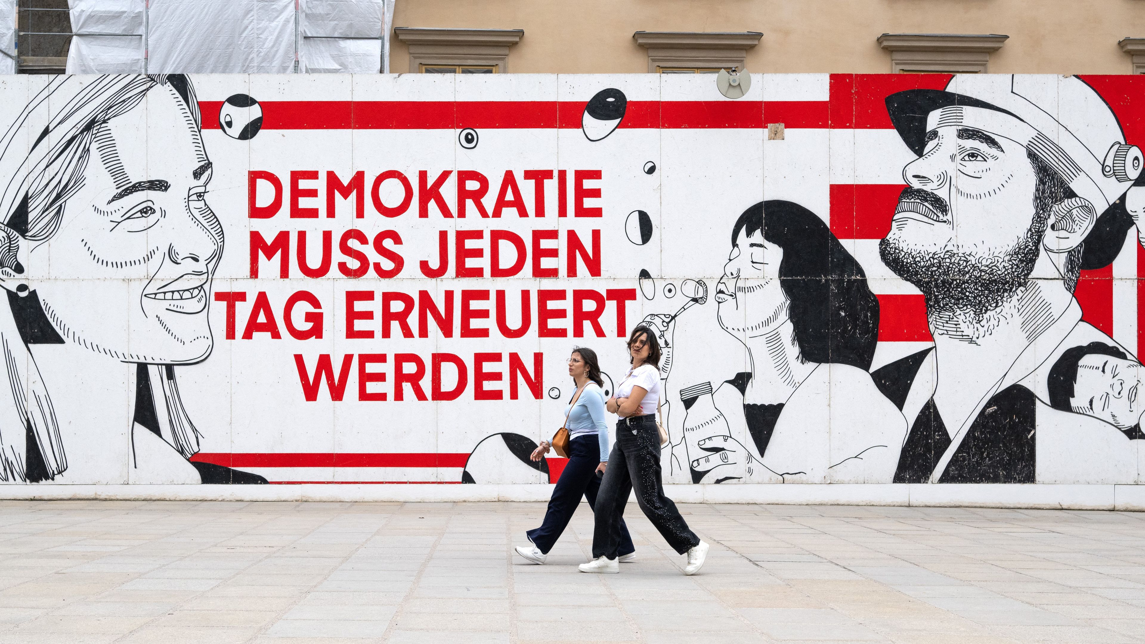 Na zdjęciu: baner na ogrodzeniu remontowanej siedziby prezydenta Austrii w Wiedniu. Napis głosi „Demokrację trzeba odnawiać codziennie". Fot. AFP