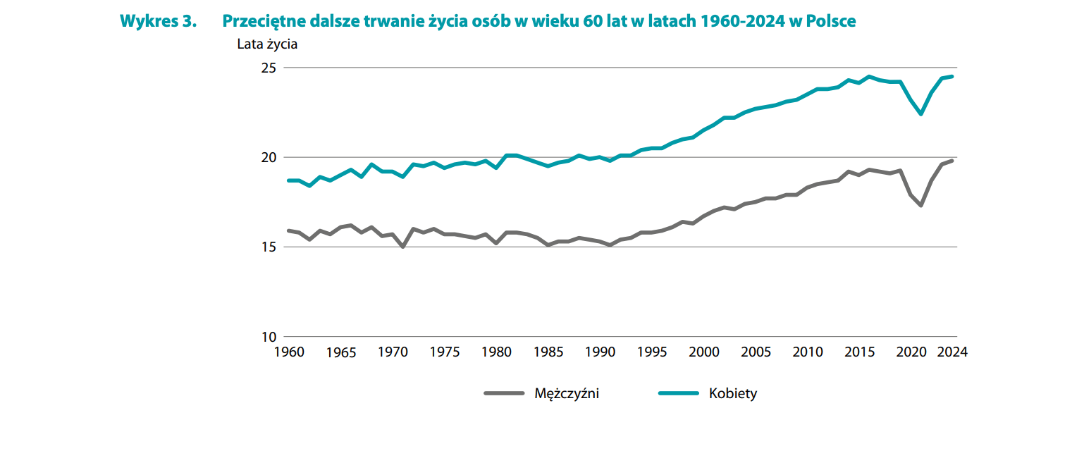 Jednak jak na poniższym wykresie, im dłużej żyją mężczyźni, tym mniej tracą do kobiet. W wieku 60 lat przewaga spada do 4,7 lat: ona pożyje jeszcze 24,5 roku, a on 19,8 lat.