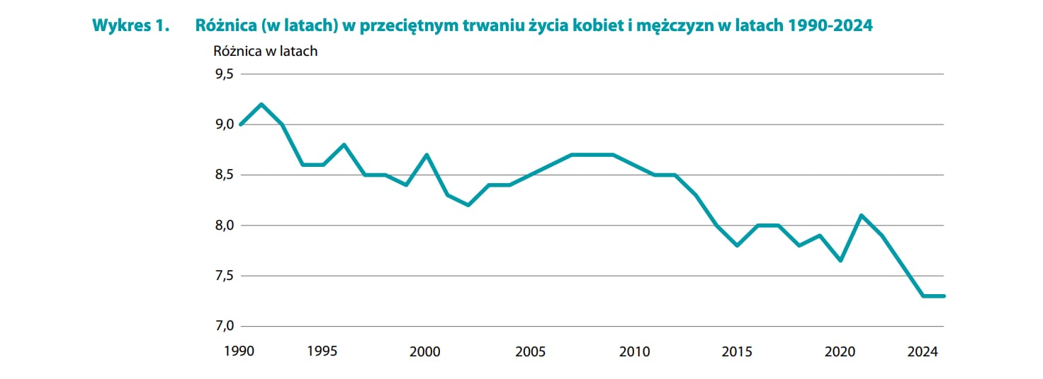 Po dwóch latach epidemii genderowa różnica w skłonności do umierania wróciła w 2022 roku do poziomu sprzed epidemii (4,9 lat), w 2023 i 2024 zaczęła dalej spadać: do 4,8 i 4,7 lat.