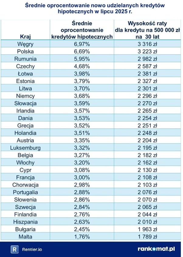 Nawet w grupie pozostających poza euro siedmiu państw UE jest tylko jedno, w którym kredyty hipoteczne są droższe niż u nas. Średnie roczne oprocentowanie kredytów na nieruchomości mieszkaniowe w lipcu 2025 roku wyniosło:
