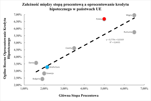 Na osi poziomej są dane Europejskiego Banku Centralnego średniego oprocentowania kredytów mieszkaniowych, a na osi pionowej dane Trading Economics głównej/referencyjnej stopy procentowej w danym kraju lub grupie państw (strefie euro). Jak widać, zależność między dwiema zmiennymi jest niemal liniowa, czyli bardzo silna.