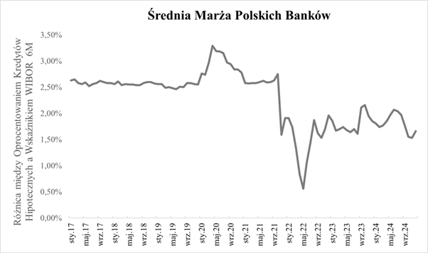 Na poniższym wykresie pokazujemy marżę banków wyliczoną jako różnica między średnim oprocentowaniem kredytów mieszkaniowych w danym miesiącu danego roku a przeciętną wartością wskaźnika WIBOR 6M w danym okresie.