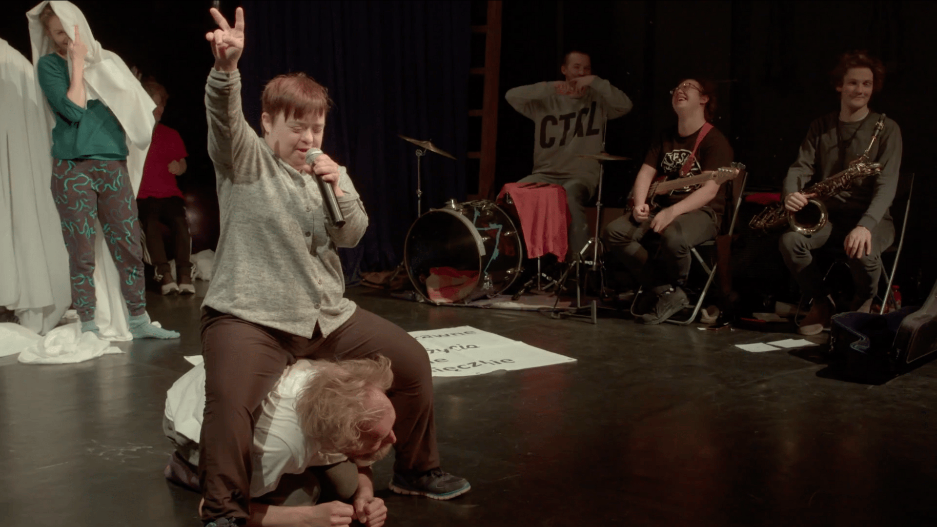 Justyna: Mówimy o tym w drugiej części „Rewolucji, której nie było”. To w niej aktorki i aktorzy Teatru 21 wyrażają swoją twórczość. Przetwarzamy zrezygnowanie i brak wiary w nowe emocje i nową energię. Zbieramy siłę do działania. Nasza energia się zbiera, kiedyś wykorzystamy ją w walce o prawa osób z niepełnosprawnościami i poprawę ich jakości życia w Polsce. W finale muzykę na żywo gra zespół „Pokusa”. Wszyscy śpiewamy „Im down in the town”. Afirmujemy to, kim jesteśmy. Protest nie udał się społecznie i politycznie. Ale się nie skończył. Został zawieszony.