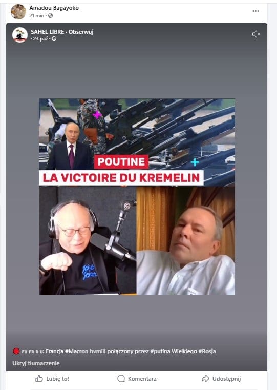 „Powiedzą, że to Rosja, wiadomo” – bardzo podobnie do Cambella ze Szkocji komentował sabotaż w Polsce Amadou Bagayoko z afrykańskiego państwa Mali. W języku francuskim komentował post zamieszczony przez France24. Amadou ma na swoim koncie dużo wpisów i zdjęć, głównie zwierząt hodowanych przez niego lub jego bliskich. Poza tym udostępnia materiały dotyczące polityki, w tym takie, które wspierają Putina. W jednym z nich znajduję specyficzne określenie – „Putin Wielki”.