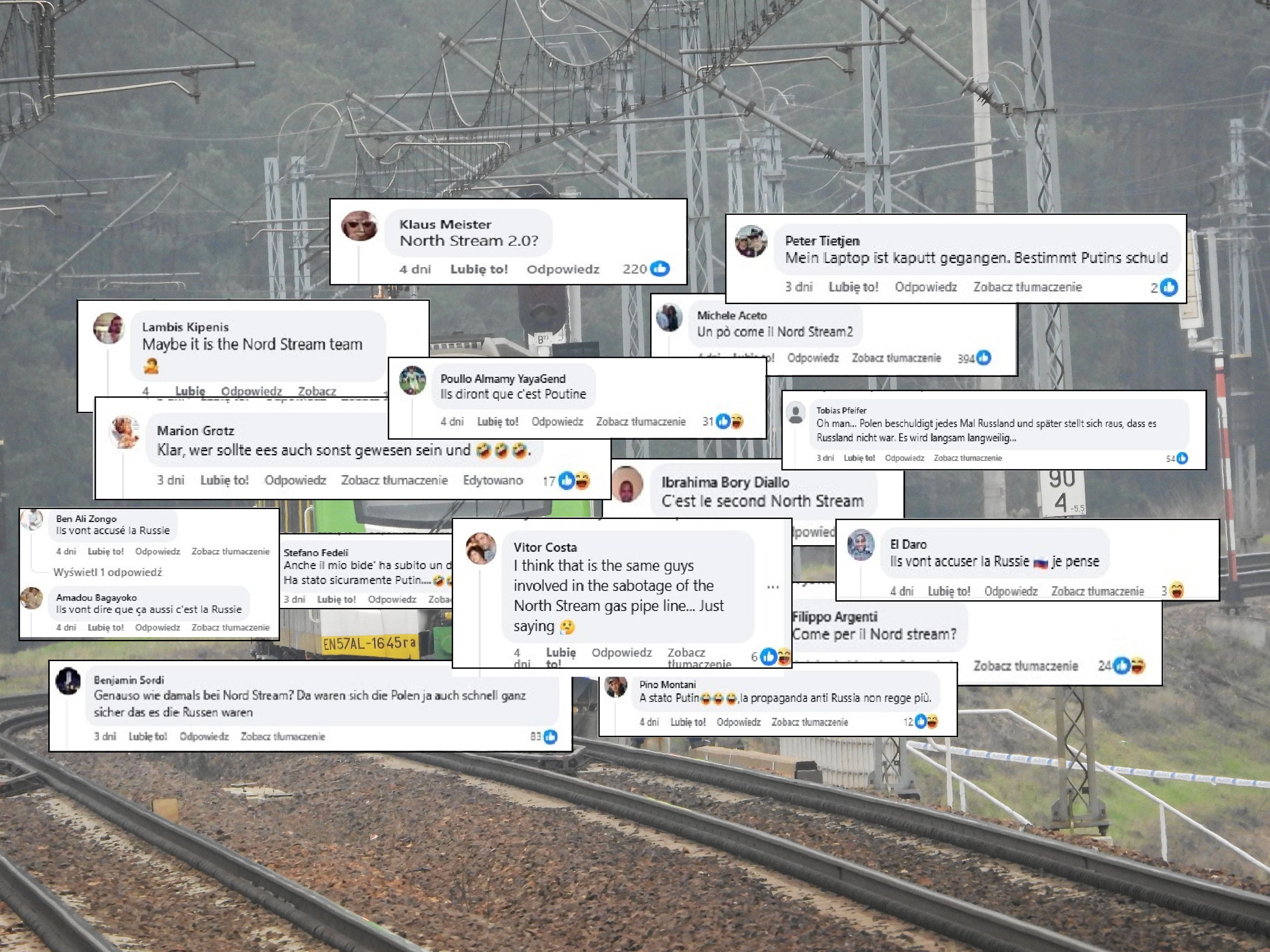 Kiedy tydzień temu zagraniczne media poinformowały o eksplozji na torach w Polsce, pod ich postami na Facebooku pojawiły się komentarze z niemal identycznym przekazem, choć w różnych językach. We wszystkich podważano odpowiedzialność Rosji za sabotaż i obwiniano Ukrainę