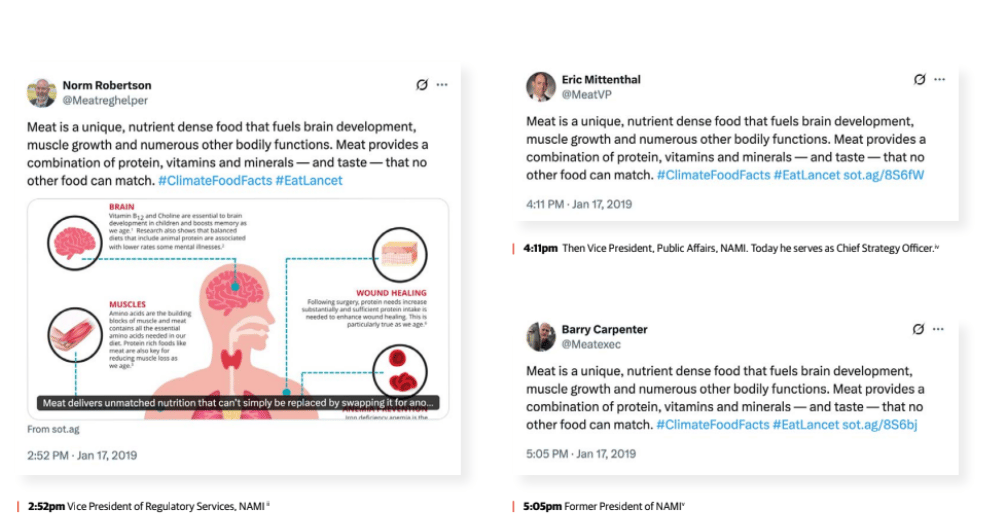 To przyjaźni przemysłowi mięsnemu naukowcy, influencerzy zajmujący się zdrowiem oraz promujący mięso lekarze, dziennikarze i publicyści. Ich treści odpowiadały za ponad dwie trzecie zaangażowania w mediach społecznościowych krytycznego wobec EAT-Lancet. Twórcy ci czasami publikowali wręcz te same treści (co pokazujemy na poniższym fragmencie raportu).