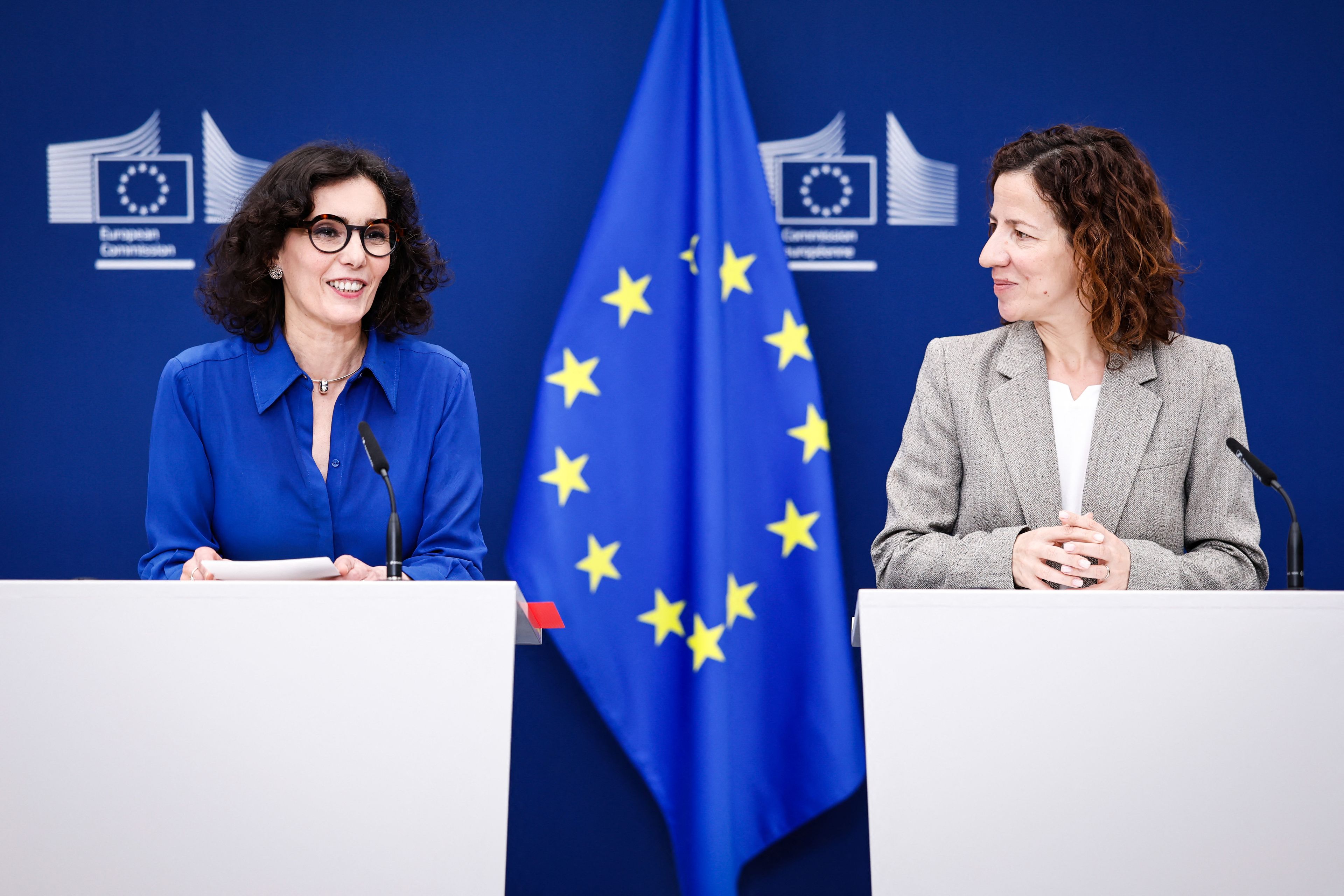 Na zdjęciu: Komisarz ds. równości, gotowości i zarządzania kryzysowego Hadja Lahbib (po lewej) oraz wiceprzewodnicząca Komisji Europejskiej ds. praw socjalnych, umiejętności, wysokiej jakości miejsc pracy i gotowości Roxana Minzatu (po prawej) na konferencji prasowej dotyczącej inicjatywy obywatelskiej „My Voice, My Choice” w siedzibie UE w Brukseli, 26 lutego 2026.