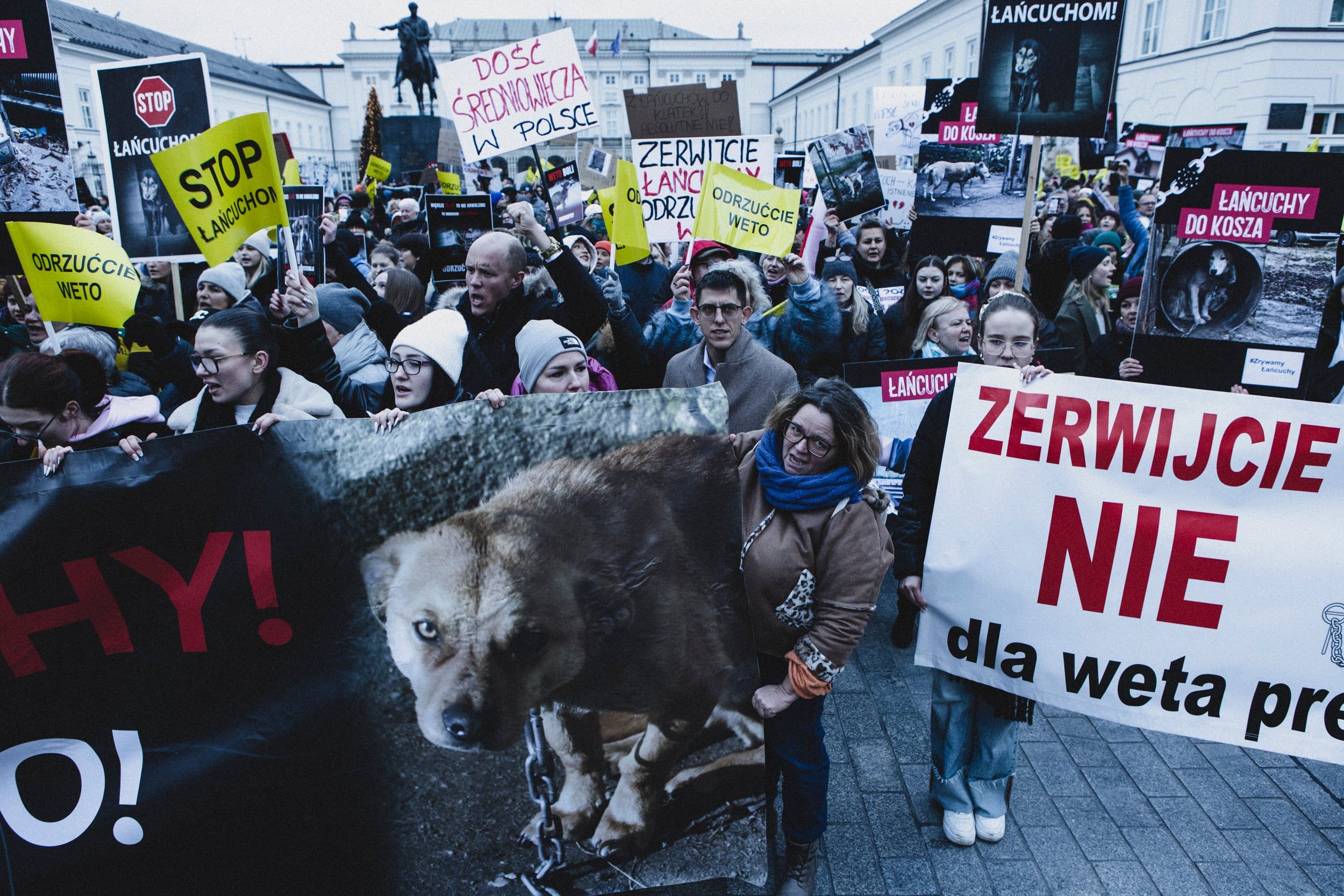 „Prezesie, miej sumienie, zakończ to cierpienie” – skandowali uczestnicy i uczestniczki marszu, który przeszedł ulicami: Wiejską, Nowym Światem i Krakowskim Przedmieściem przed Pałac Prezydencki. Na banerach, które widać było w tłumie, uczestnicy pisali „Zerwijmy razem łańcuchy”, „Wolne pieski”, „Ich cierpienie nie ma głosu”, „Weto=wyrok”. W marszu wzięły udział też psy, również takie, które zostały uratowane z łańcucha.