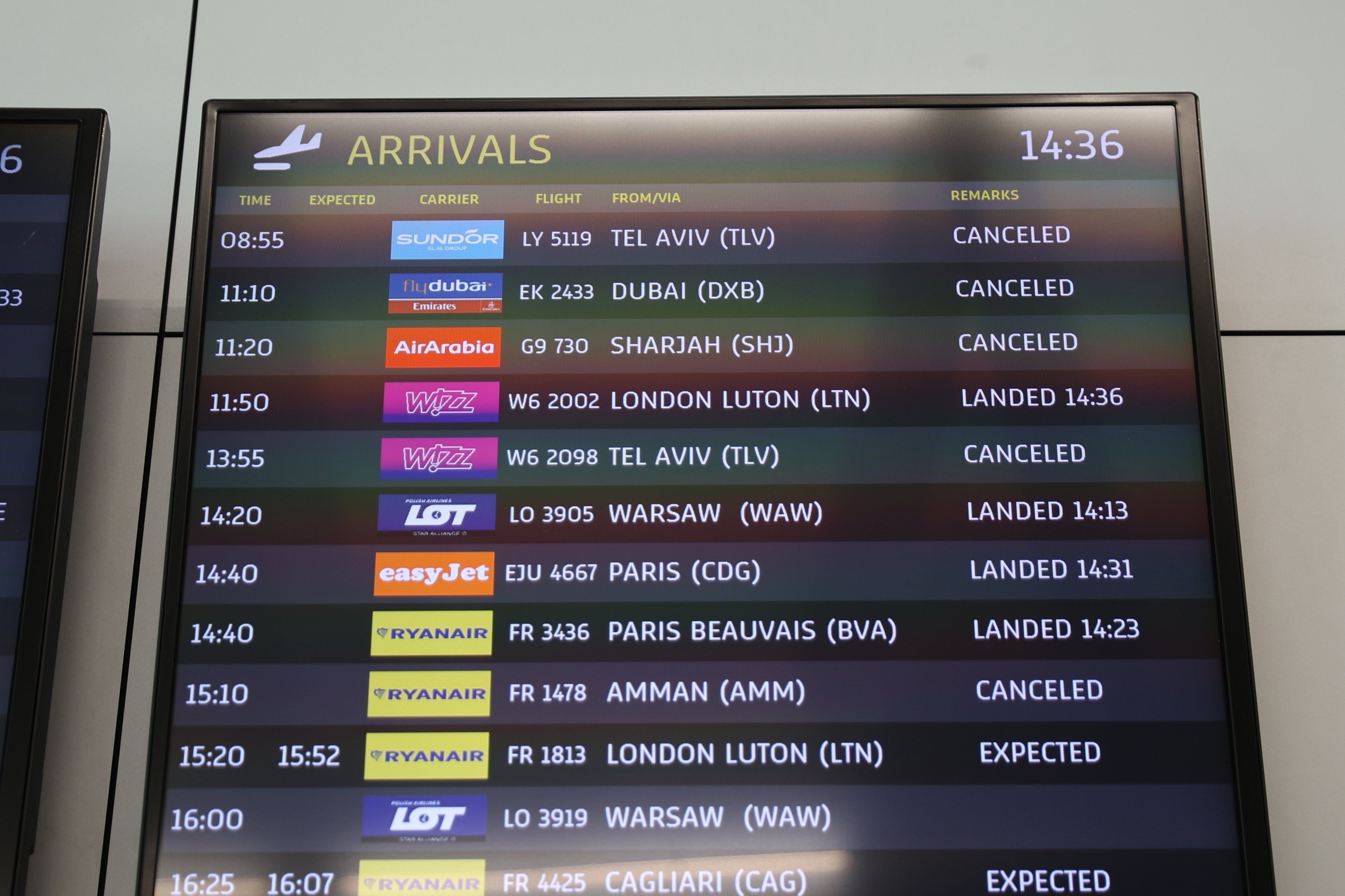 Na zdjęciu – tablica informacyjna na loitnisku Balice w Krakowie. Fot. Jakub Wlodek / Agencja Wyborcza.pl