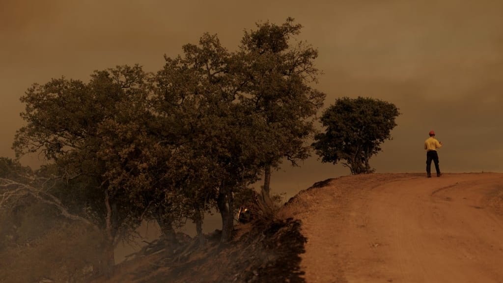Na zdjęciu: strażak obserwuje pożar w lasu Los Padres w Kalifornii, sierpień 2o25 r.