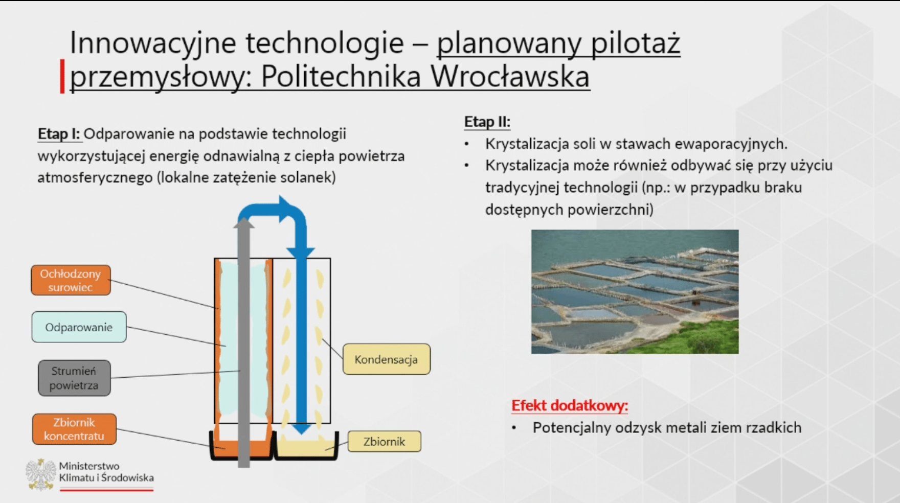 Pilotaż tej technologii na większą skalę, przy jednym z państwowych zakładów, ma zacząć się w czwartym kwartale 2025 roku i potrwać półtora roku. Szacowany koszt odsalania wód kopalnianych to 5 mld zł rozłożone na 10 lat.