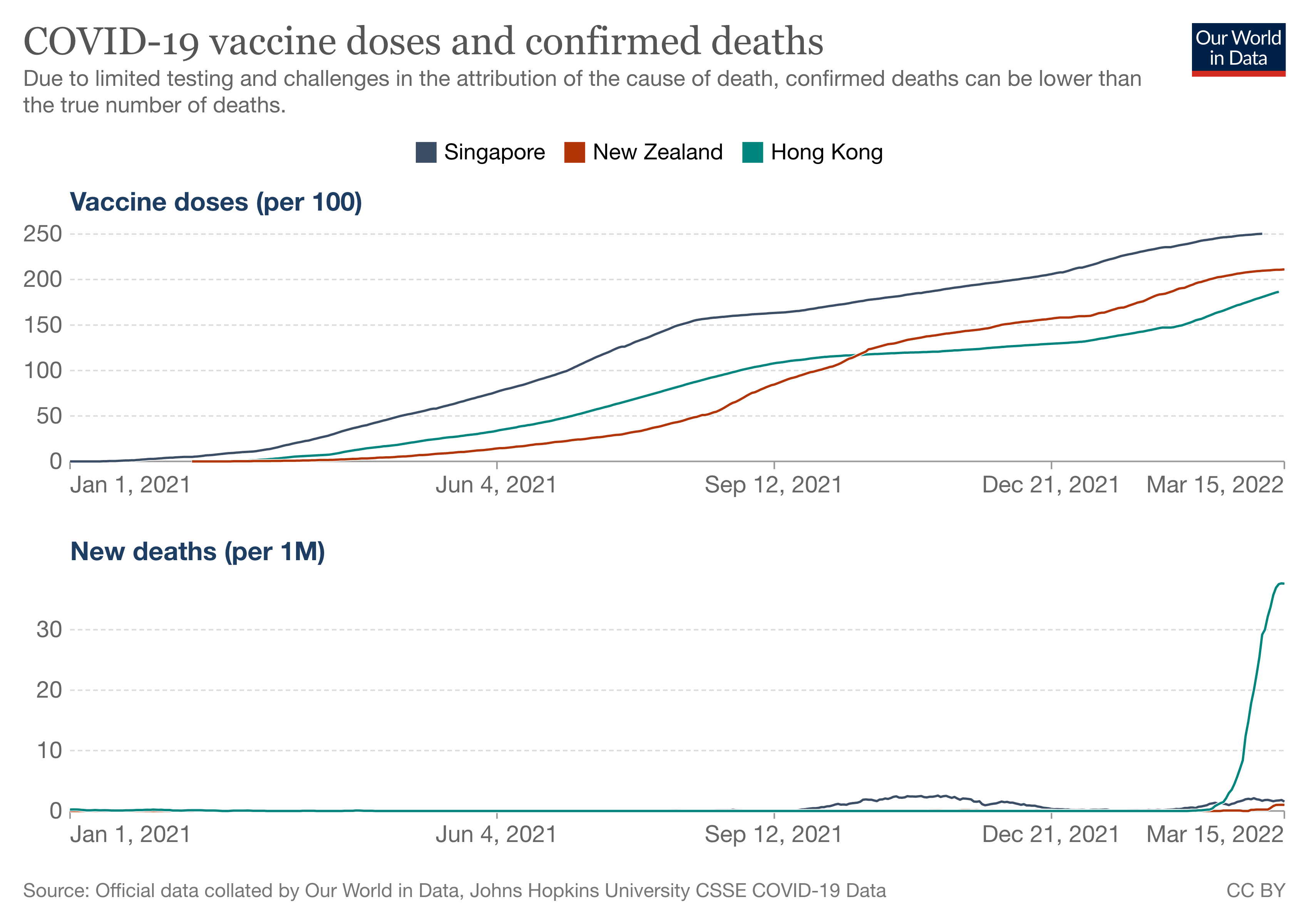 Jeśli jednak porównać sytuację w trzech miejscach, które prowadziły politykę „zero covid", a teraz doświadczają fali omikrona, widać dramatyczną różnicę pomiędzy Hong Kongiem, a Singapurem i Nową Zelandią - tam wzrost zgonów jest nieznaczny. Odpowiedź leży w odsetku niezaszczepionych najstarszych mieszkańców: w Nowej Zelandii i Singapurze to kilka procent, w Hong Kongu - dwie trzecie.