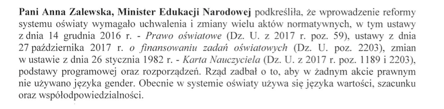 Minister wyliczyła nowe regulacje wprowadzone przez ministerstwo i przy okazji zapewniła: „Rząd zadbał o to, by w żadnym akcie prawnym nie używano języka gender. Obecnie w systemie oświaty używa się języka wartości, szacunku oraz współodpowiedzialności". Zapewniła o tym niemal w pierwszym zdaniu, jeżeli wierzyć protokołowi z posiedzenia: