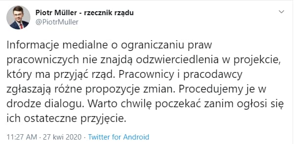 Rzecznik rządu Piotr Müller napisał na Twitterze: "Informacje medialne o ograniczaniu praw pracowniczych nie znajdują odzwierciedlenia w projekcie, który ma przyjąć rząd. Pracownicy i pracodawcy zgłaszają różne propozycje zmian. Procedujemy je w drodze dialogu. Warto chwilę poczekać, zanim ogłosi się ich ostateczne przyjęcie".