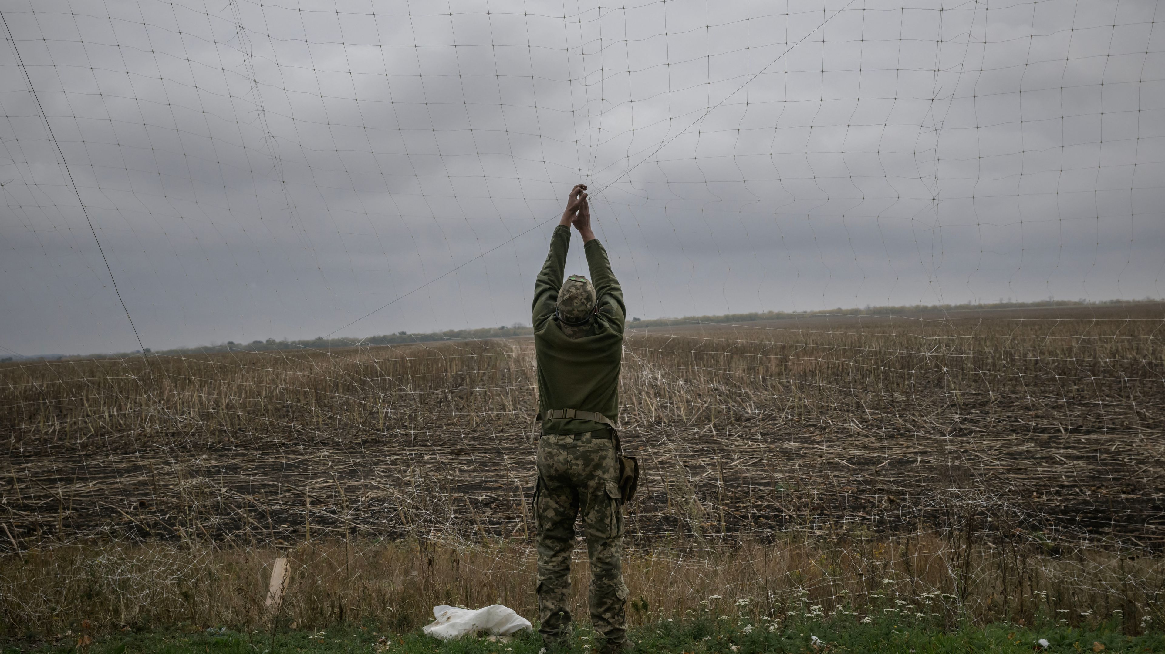 Na zdjęciu: Żołnierz przygotowuje sieci chroniące przed atakami dronów wzdłuż drogi w pobliżu Ołeksandriwki, 6 października 2025. (Ed JONES / AFP)