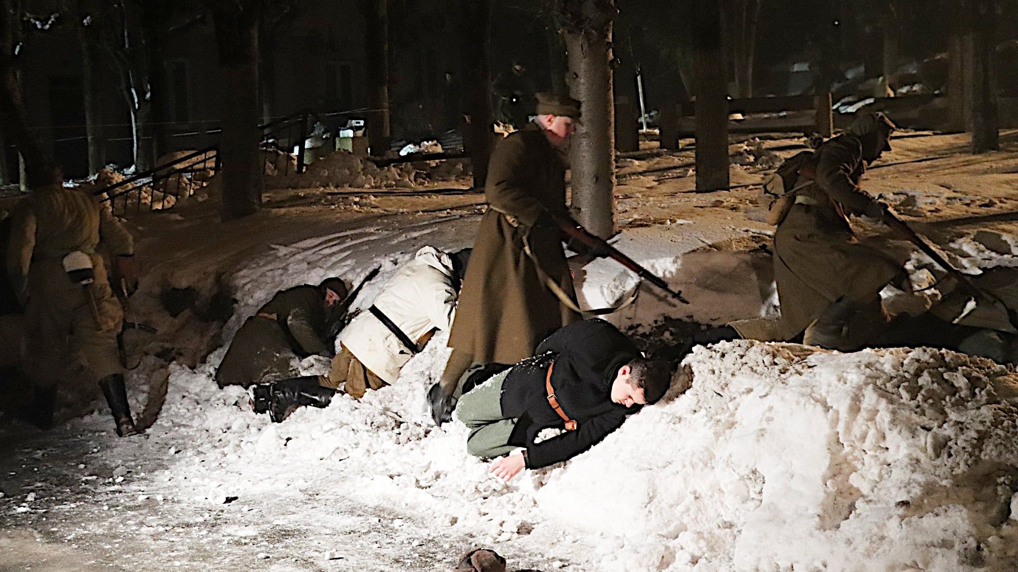 „Zabici” leżą na śniegu. Jeden z „polskich” mundurowych podchodzi do nich, wyjmuje im broń z rąk, sprawdza, czy na pewno nie żyją. „Ten jeszcze żyje!” – krzyczy. „Zabrać go do sztabu, nie zabijać jeńców!” – słychać rozkaz.