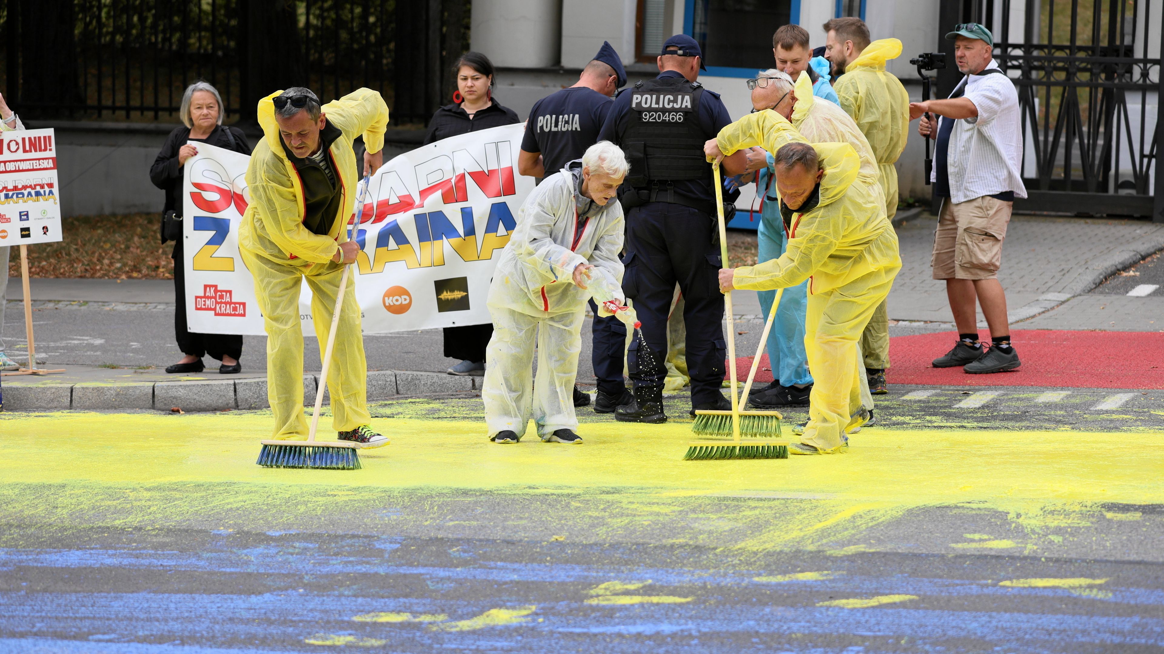 Rosjanie ściągnęli także warszawskie służby miejskie. Już 30 minut po zakończonej akcji panowie zmywali kolory niebieski i żółty z jezdni. Po dwóch godzinach już niewiele zostało.