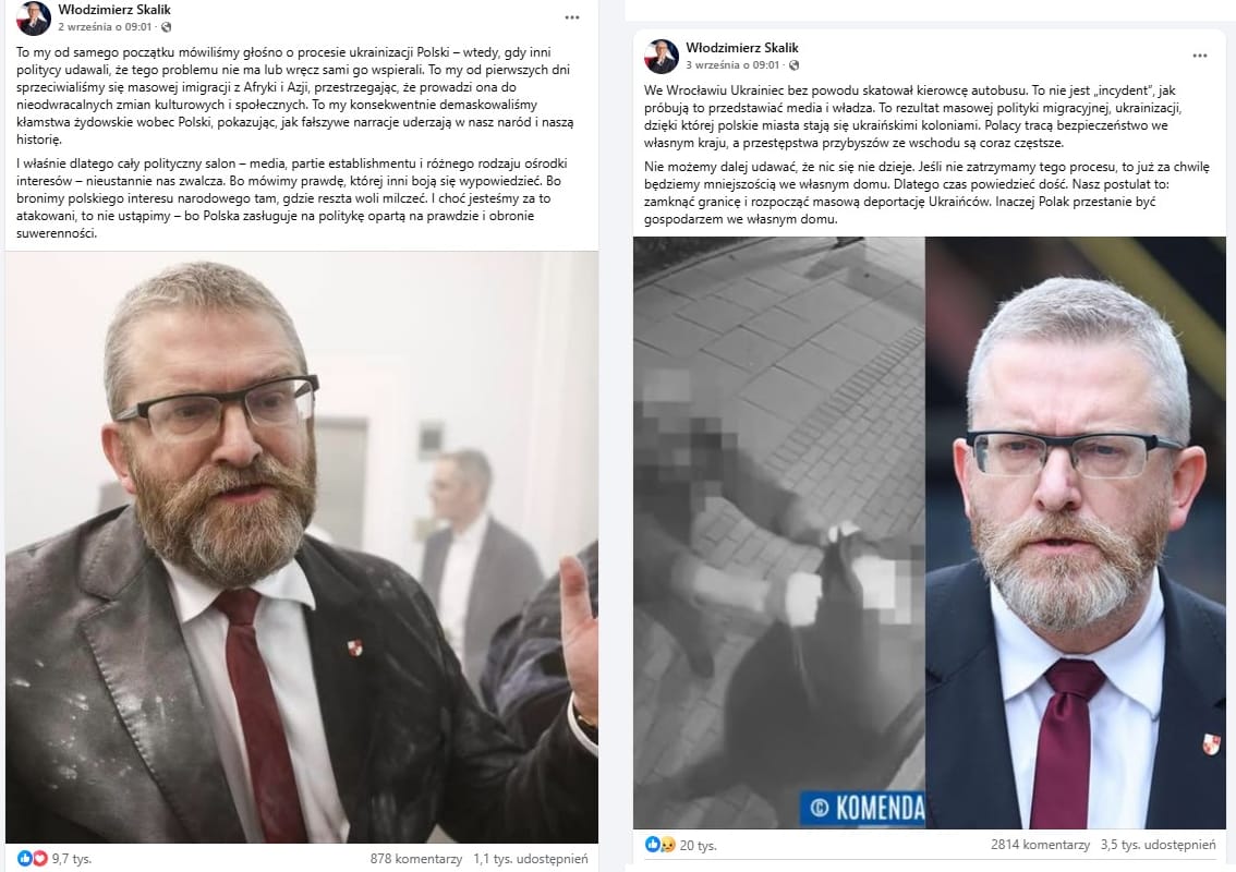 Oto wpis Włodzimierza Skalika z Facebooka, z 3 września: „We Wrocławiu Ukrainiec bez powodu skatował kierowcę autobusu. To nie jest „incydent”, jak próbują to przedstawiać media i władza. To rezultat masowej polityki migracyjnej, ukrainizacji, dzięki której polskie miasta stają się ukraińskimi koloniami. Polacy tracą bezpieczeństwo we własnym kraju, a przestępstwa przybyszów ze wschodu są coraz częstsze. Nie możemy dalej udawać, że nic się nie dzieje. Jeśli nie zatrzymamy tego procesu, to już za chwilę będziemy mniejszością we własnym domu. Dlatego czas powiedzieć dość.