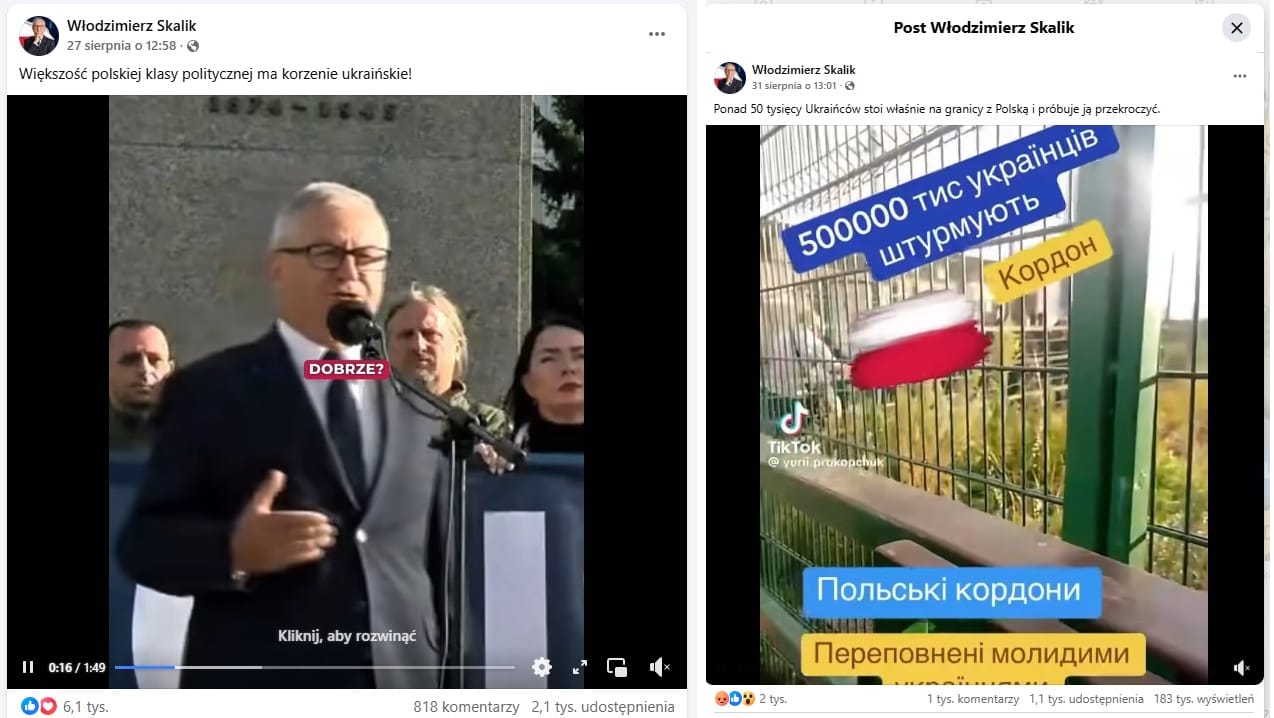 Jest jeszcze udostępniony przez Skalika filmik z TikToka, z którego można się dowiedzieć, że „50 tysięcy Ukraińców właśnie teraz szturmuje polską granicę”. To wpis zwiększający u odbiorców poczucie zagrożenia, znów niemający nic wspólnego z prawdą. Na granicy przez kilka dni ustawiały się kolejki Ukraińców, ponieważ władze Ukrainy wprowadziły przepisy, liberalizujące nieco zasady wyjazdu z tego państwa. Nie było jednak żadnego szturmu ani 50 tysięcy ludzi w jednej kolejce.