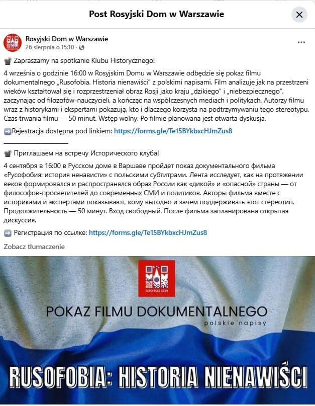 4 września. W Rosyjskim Domu w Warszawie odbywa się pokaz filmu „Rusofobia. Historia nienawiści”. To materiał wyprodukowany przez rosyjską propagandową stację telewizyjną RT [skrót od Russia Today], objętą sankcjami w Unii Europejskiej. Stacja jest blokowana, by nie docierała ze swoimi programami m.in. do Polaków. Rosyjski Dom obchodzi nałożone na RT sankcje.