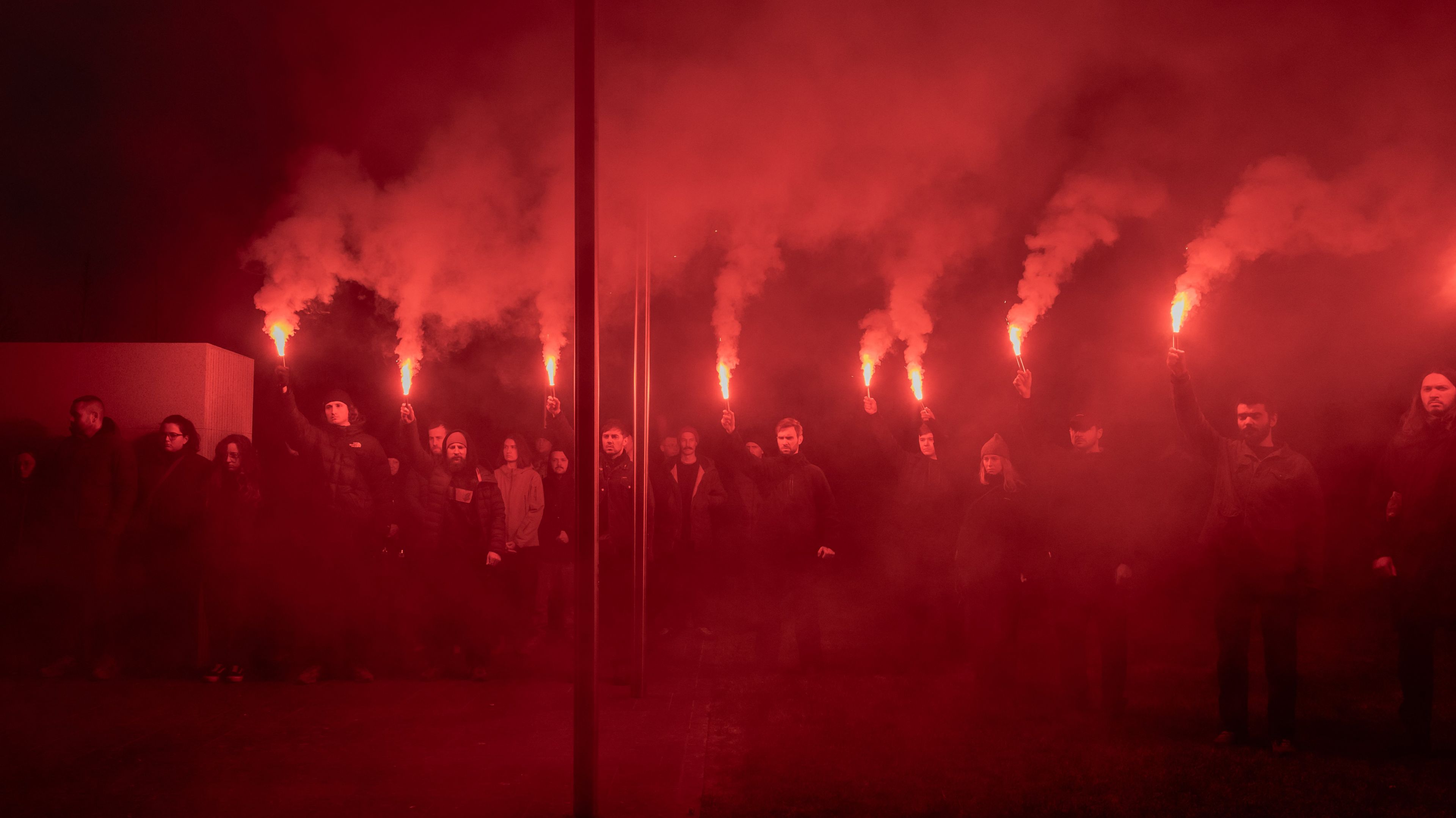 Na zdjęciu: Pochodnie płoną podczas pogrzebu Artura Wilczynskiego, żołnierza jednostki przeciwlotniczej Barracuda, który zginął pod Czernichowem. Cmentarz wojskowy nieopodal Kijowa, 28 listopada 2025. Fot. Roman PILIPEY/AFP