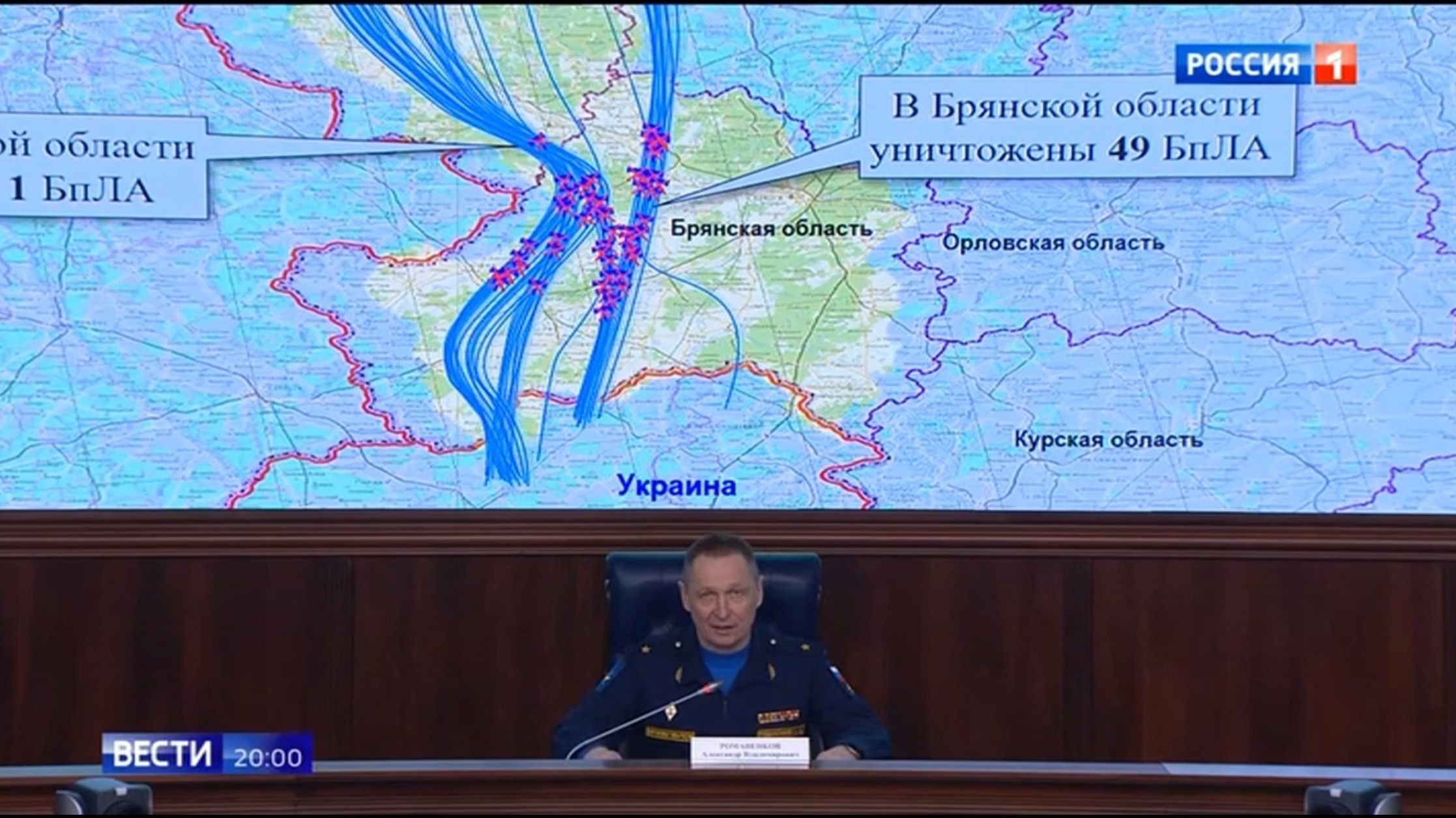 “Atak wroga, jak pokazano na mapie, został przeprowadzony w kilku kierunkach, w kierunku rezydencji prezydenta Rosji nad obwodami briańskim, smoleńskim, twerskim i nowogrodzkim, przy użyciu 91 bezzałogowych statków powietrznych” – powiedział Romanienkow skazując kreseczki na mapie.