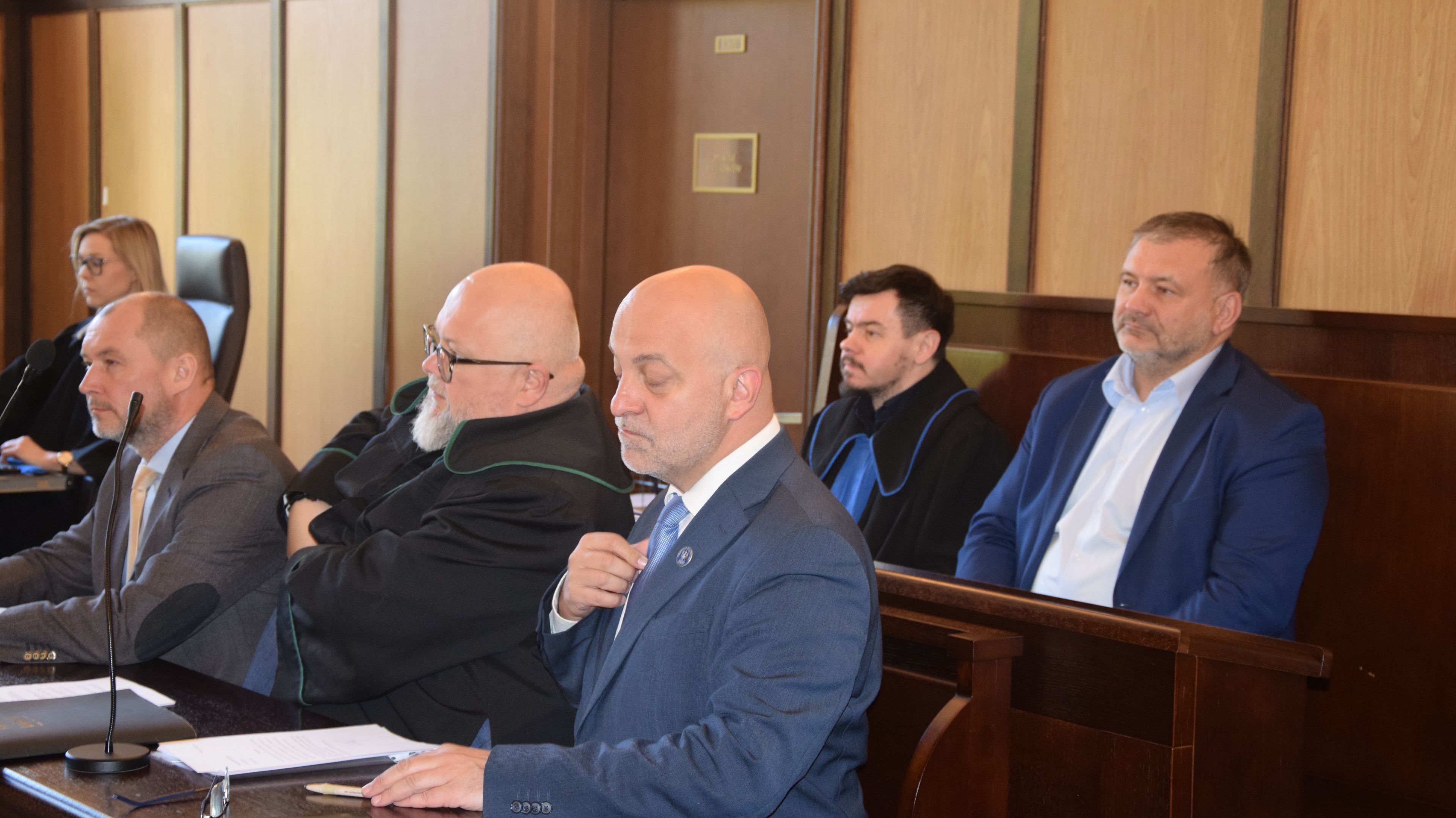 Na zdjęciu o góry proces za aferę hejterską. W drugim rządzie od prawej siedzi minister sprawiedliwości Waldemar Żurek, a obok niego siedzi pełnomocnik ministerstwa sprawiedliwości, radca prawny Marek Lewandowski. W pierwszym rzędzie od prawej siedzi sędzia Łukasz Piebiak, mec. Krzysztof Wąsowski i sędzia Jakub Iwaniec. Fot. Mariusz Jałoszewski.