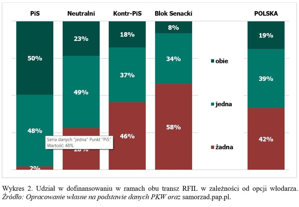 Podział środków powiela wcześniej występujący wzór. W gminach większych różnica pomiędzy tymi, w których burmistrz jest przedstawicielem partii rządzącej, a tymi rządzonymi przez przedstawicieli opozycji nie uległa żadnej zmianie. Nadal przeciętna gmina, gdzie jest włodarz z PiS, otrzymuje ponad dziesięciokrotnie większe dotacje.