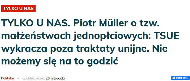 Europoseł PiS Piotr Müller twierdzi, że wyrok Trybunału Sprawiedliwości Unii Europejskiej w sprawie uznania przez Polskę praw małżeństw jednopłciowych zawartych w innych państwach UE to „wykroczenie poza traktaty unijne”. Sprawdziliśmy