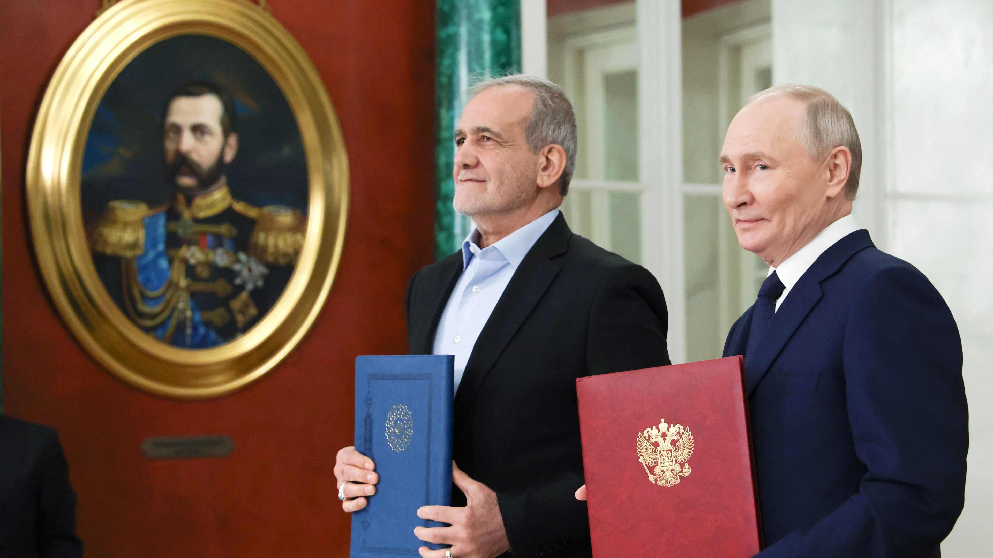 Na zdjęciu głównym – Putin i Pezeszkian z podpisanym 17 stycznia 2025 roku traktatem o kompleksowym partnerstwie strategicznym. Pozują pod portretem cara Aleksandra II, co pokazuje imperialne aspiracje Kremla. Ekipa Putina mentalnie jest w XIX wieku, czasach potęgi Rosji, dlatego też obecne wypadki są dla Kremla tak bolesne. Fot. Vyacheslav PROKOFYEV/POOL/AFP