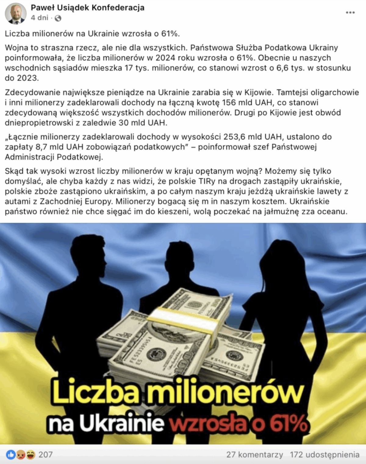 7 maja 2025 roku użytkownik Paweł Usiądek, lokalny działacz Konfederacji w okręgu płocko-ciechanowskim, opublikował na Facebooku wpis, w którym sugeruje, że Ukraina w czasie wojny przeżywa boom bogactwa. Powołując się na dane Państwowej Służby Podatkowej Ukrainy, twierdzi, że w 2024 roku liczba milionerów w Ukrainie wzrosła aż o 61 procent w porównaniu z rokiem poprzednim – do 17 tysięcy osób. Sugeruje przy tym, że Ukraińcy bogacą się „kosztem Polaków” oraz że ich państwo „nie chce sięgać im do kieszeni”. Wpis udostępniono kilkaset razy. Co mówią fakty?