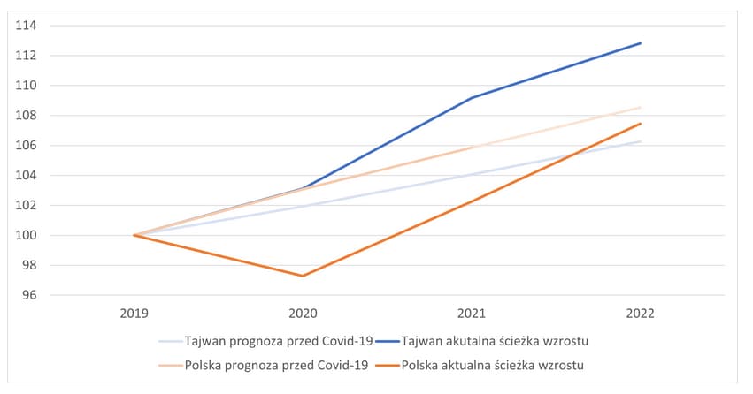 Rycina 3. porównuje obecnie realizowaną ścieżkę wzrostu gospodarczego z tą prognozowaną przed wybuchem pandemii COVID-19. Wykres pokazuje produkt krajowy brutto (PKB) w cenach stałych, dla czytelności porównań wartość w roku 2019 została znormalizowana do 100. Porównane są dwie gospodarki: Polski (kolorami pomarańczowymi) i Tajwanu (kolorami niebieskimi). Polska gospodarka w 2020 roku w wyniku pandemii COVID-19 doświadczyła recesji i „spadła” ze swojej prognozowanej ścieżki wzrostu o około 6%. Podobna sytuacja o różnym natężeniu miała miejsce w prawie wszystkich gospodarkach świata. Wedle obecnych prognoz polska gospodarka wróci na ścieżkę wzrostu sprzed pandemii w roku 2024. Tajwan jest przykładem wyjątkowym, jego gospodarka nie tylko nie doświadczyła recesji, ale w roku 2020 rozwijała się nawet o 2% szybciej od swojej prognozy.