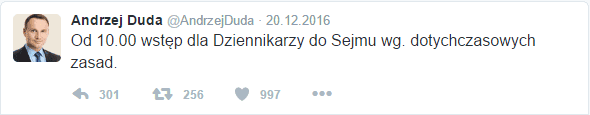 20 grudnia prezydent Andrzej Duda powtórzył deklaracje marszałka. "Od 10.00 wstęp dla dziennikarzy do Sejmu wg. dotychczasowych zasad” - napisał na Twitterze. Podobny komunikat pojawił się na stronie internetowej Sejmu.