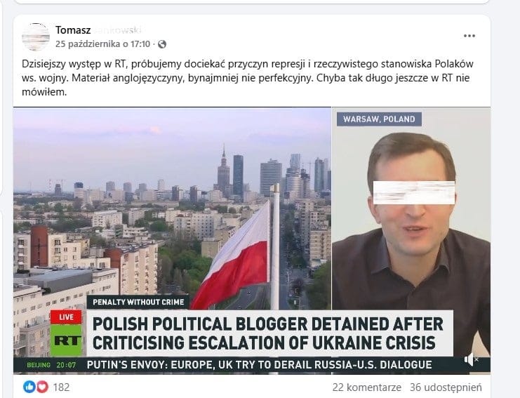 Z tego powodu Tomasz J., jak sam napisał na Facebooku, nie pojechał do Rosji na Międzynarodowe Forum Ludowej Dyplomacji. Gdyby nie zakaz, brylowałby właśnie na moskiewskich salonach. Za to niedługo po prokuratorskim przesłuchaniu udzielił wywiadu rosyjskiej propagandowej telewizji RT, objętej sankcjami w Polsce.