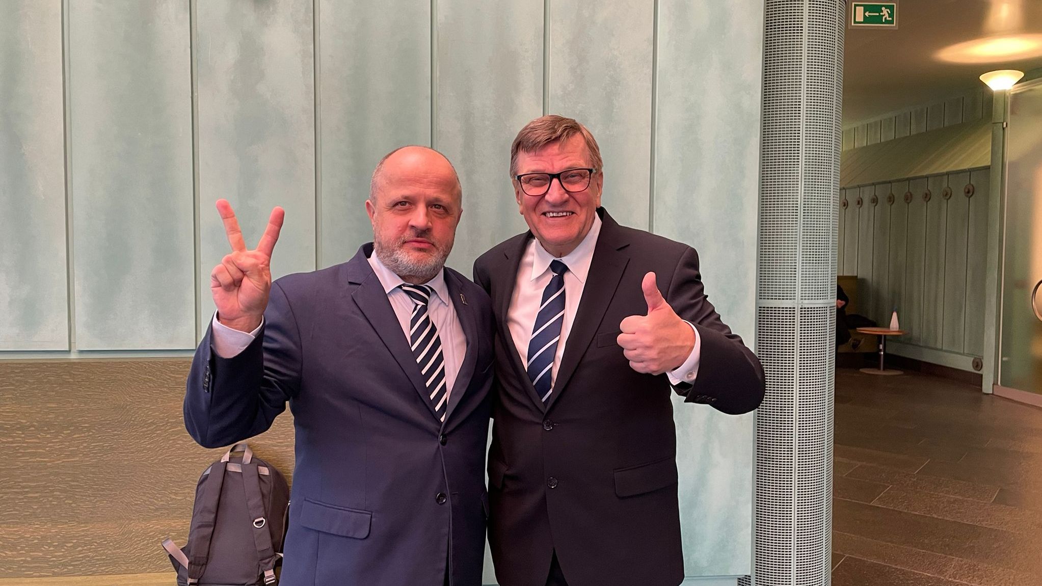 Na zdjęciu u góry sędzia Piotr Raczkowski i sędzia Piotr Gąciarek, jeden z jego obrońców w sprawie o uchylenie mu immunitetu. Zdjęcie zrobiono w grudniu 2022 roku po ostatecznej odmowie wydania zgody na ściganie Raczkowskiego przez Izbę Odpowiedzialności Zawodowej SN. Fot. Bartłomiej Dąbrowski/Wolne Sądy.